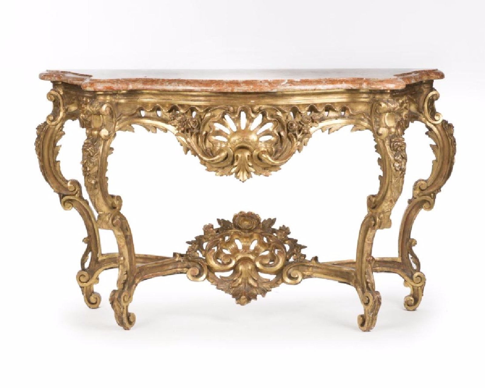A large and fine French gilt wood console with pink and orange marble top. Elaborately carved foliate and scrolled legs centering a pierced rocaille and foliatre-adorned medallion, raised overall on scroll feet. Mid 19th Century.