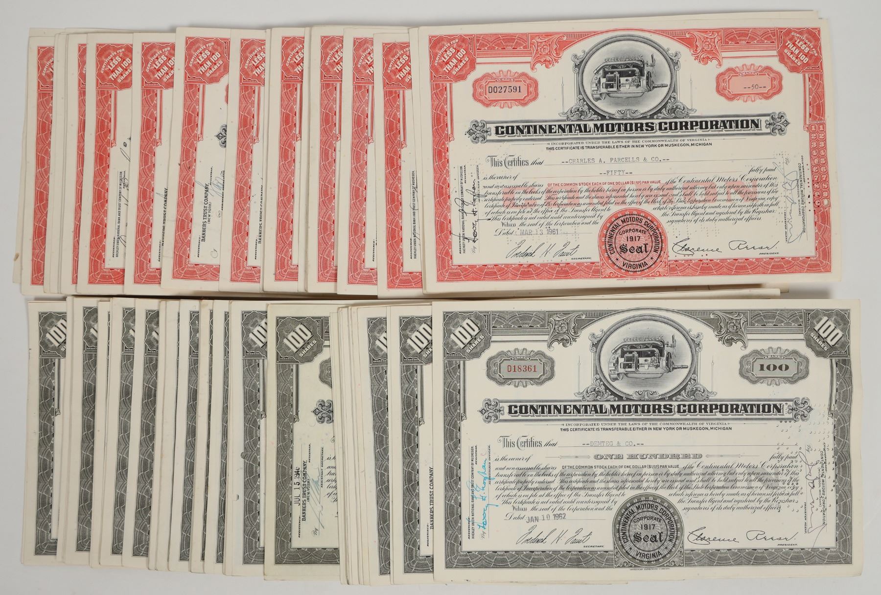 About 160 Continental Motors Corp. Stocks issued c.1955-65 in 2 varieties (red and black). Incorporated in 1917 Continental Motors was a manufacturer of internal combustion engines until the mid 1960s, which it supplied to many independent manufacturers of automobiles, tractors, trucks, and stationary equipment, as well an automobile manufacturer under the name Continental Automobile Company (1932–1933) and a producer of aircraft engines under the name Continental Aircraft Engine Company (formed in 1929) which eventually became the core business of Continental Motors, Inc. and a supplier of the U.S. military.