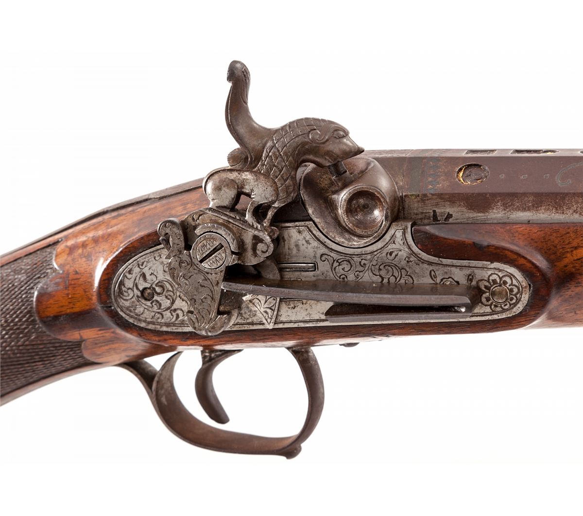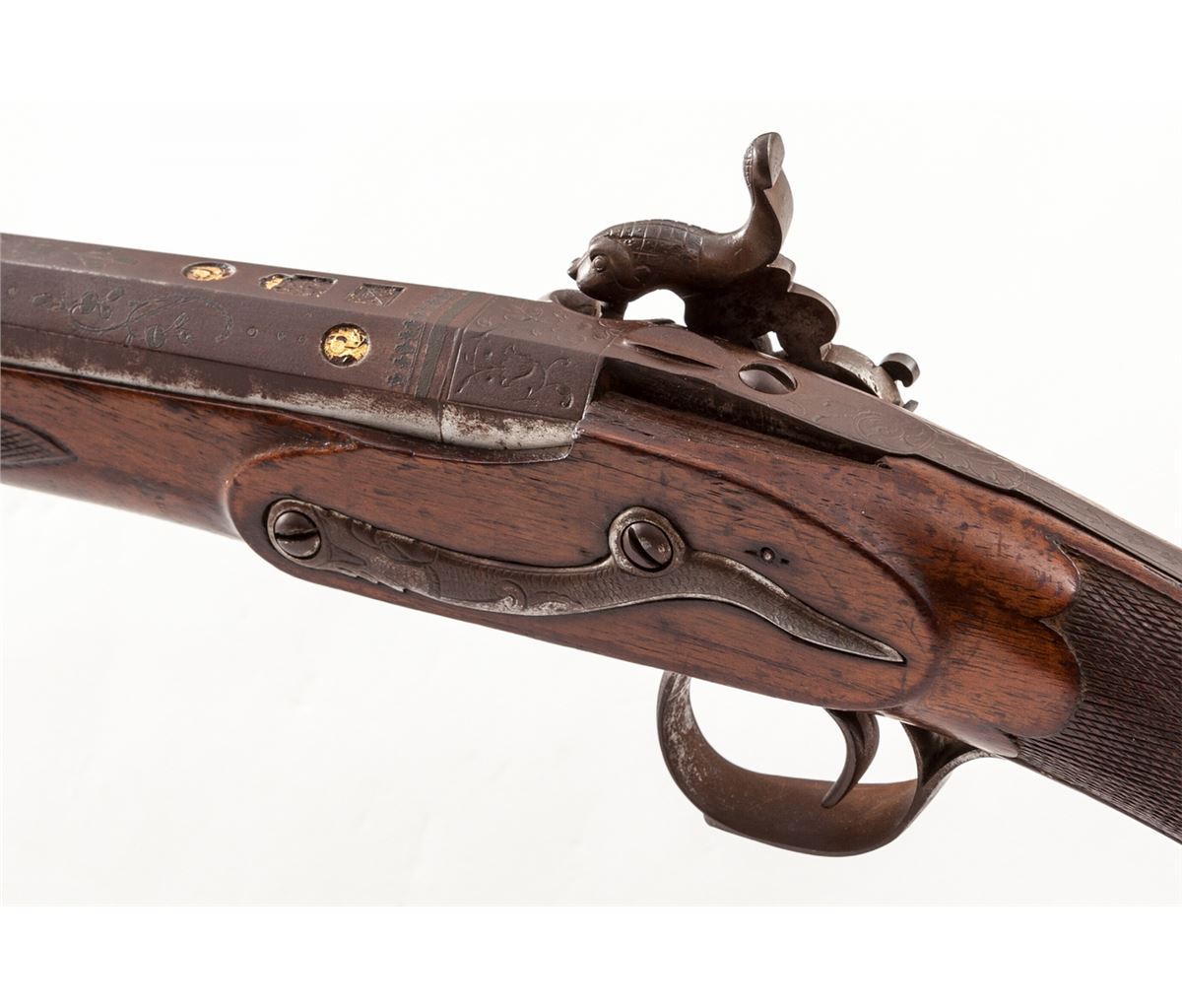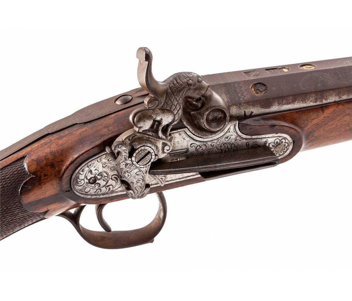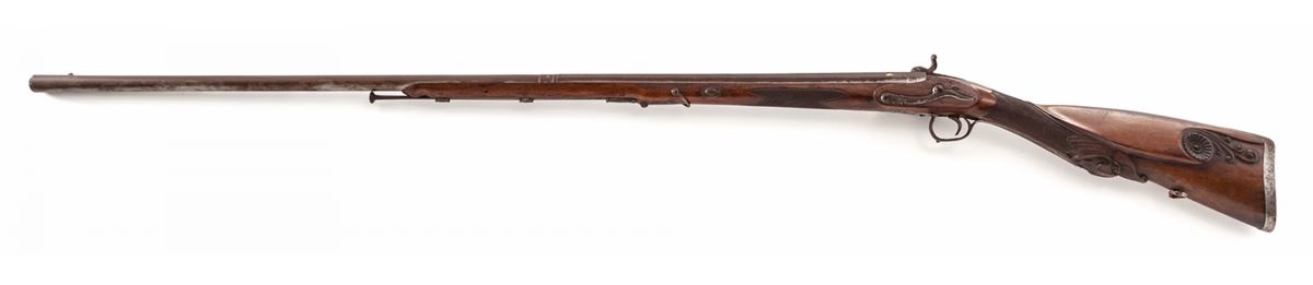 Continental Mid-19th Century Percussion Miquelet Fowler, from the Eibar region of Spain, and dated 1844, bore measures .64, barrel length approx. 41-1/2'', adorned with light silver inlay; top flat marked ''Herradura'', right side flat marked ''En Eibar'', left side flat marked ''Ano 1844'', with light scrolls and applied animal scenes. Five Spanish proofmarks at breech show residual gold foil. Lightly scroll engraved Miquelet lock features integrate pierced dog's head and body hammer. Carved checkered fine Mediterranean walnut halfstock with serpent head pistol grip, and scroll and floret cheekpiece. Steel buttplate with trap. Condition is near fine with moderate even patination to exposed portion of barrel, which could either be cleaned or left alone. Lockplate and hammer details remain mostly clean and bright, with good crisp definition to all mechanical edges and surfaces. Checks show mild flattening, more pronounced at forend. Stock with fractures to both edges of forend tip. Good crisp action, bore is fair. No doubt owned by a successful merchant or land owner. Est.: $1,200-$1,800. (Antique)