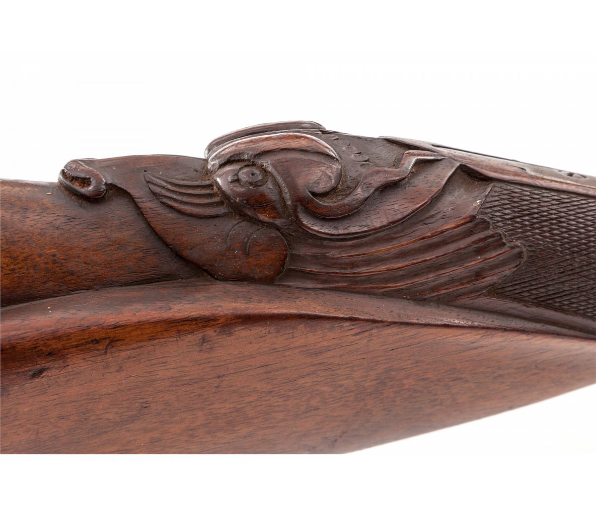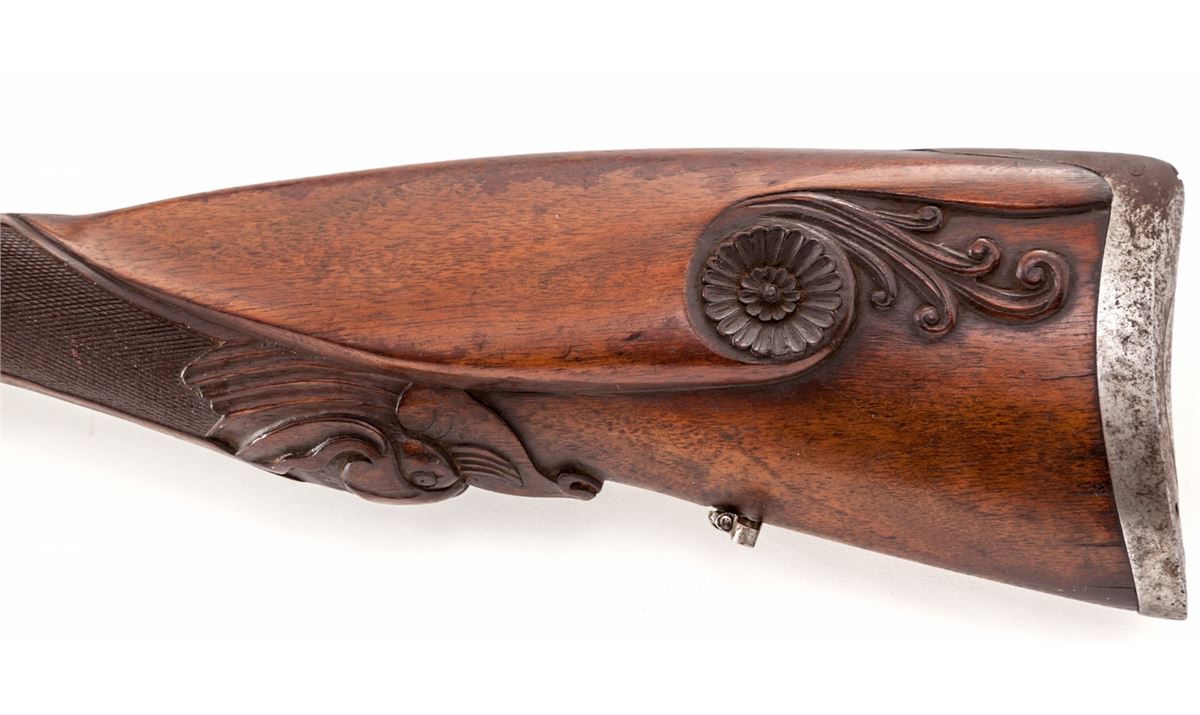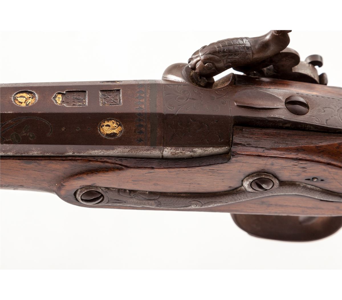 Continental Mid-19th Century Percussion Miquelet Fowler, from the Eibar region of Spain, and dated 1844, bore measures .64, barrel length approx. 41-1/2'', adorned with light silver inlay; top flat marked ''Herradura'', right side flat marked ''En Eibar'', left side flat marked ''Ano 1844'', with light scrolls and applied animal scenes. Five Spanish proofmarks at breech show residual gold foil. Lightly scroll engraved Miquelet lock features integrate pierced dog's head and body hammer. Carved checkered fine Mediterranean walnut halfstock with serpent head pistol grip, and scroll and floret cheekpiece. Steel buttplate with trap. Condition is near fine with moderate even patination to exposed portion of barrel, which could either be cleaned or left alone. Lockplate and hammer details remain mostly clean and bright, with good crisp definition to all mechanical edges and surfaces. Checks show mild flattening, more pronounced at forend. Stock with fractures to both edges of forend tip. Good crisp action, bore is fair. No doubt owned by a successful merchant or land owner. Est.: $1,200-$1,800. (Antique)