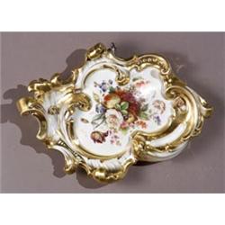 Cartouche form, the center polychrome decorated with fruit and floral bouquet on a white ground highlighted with gilt.