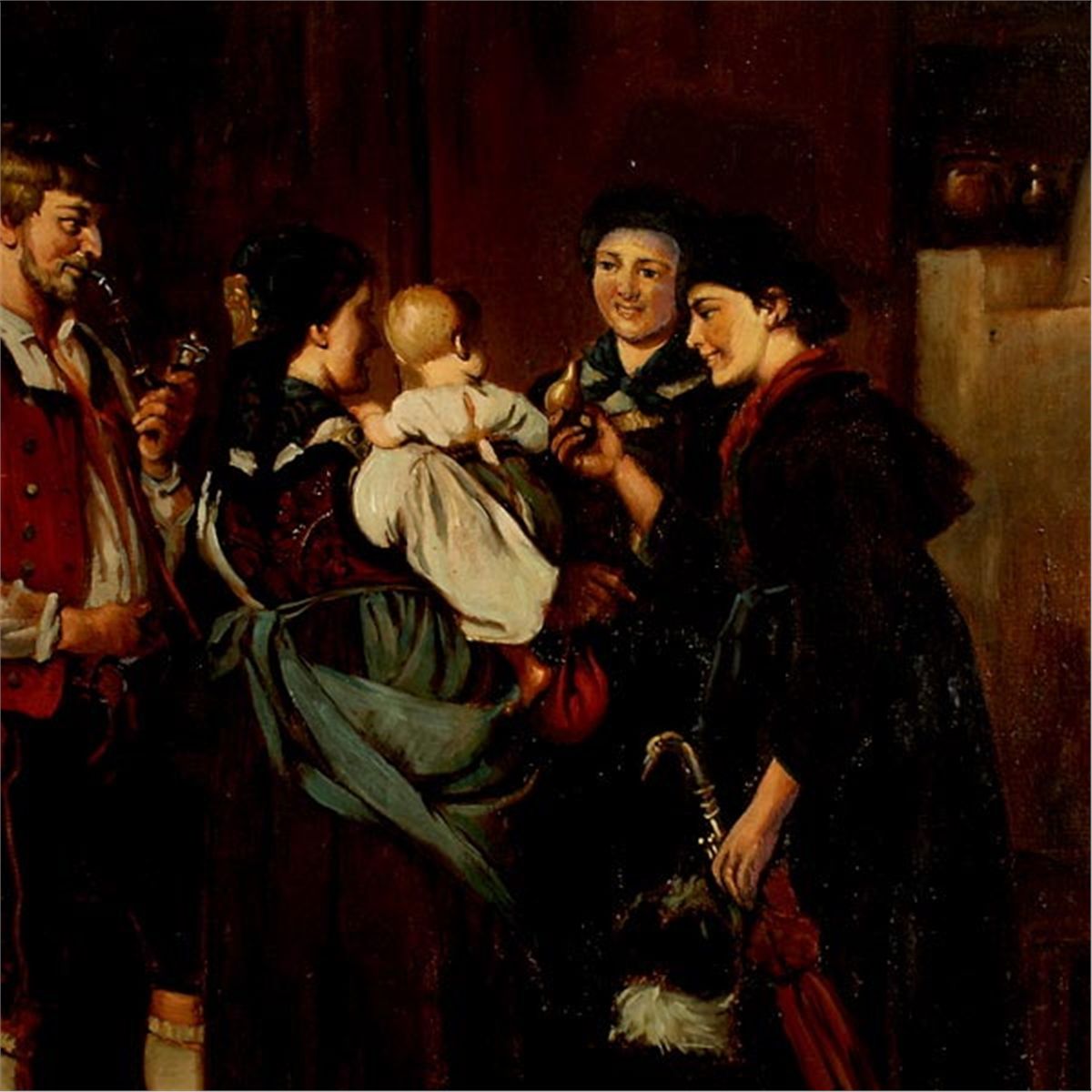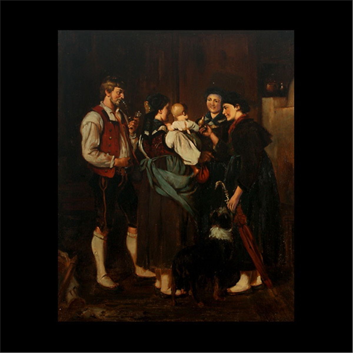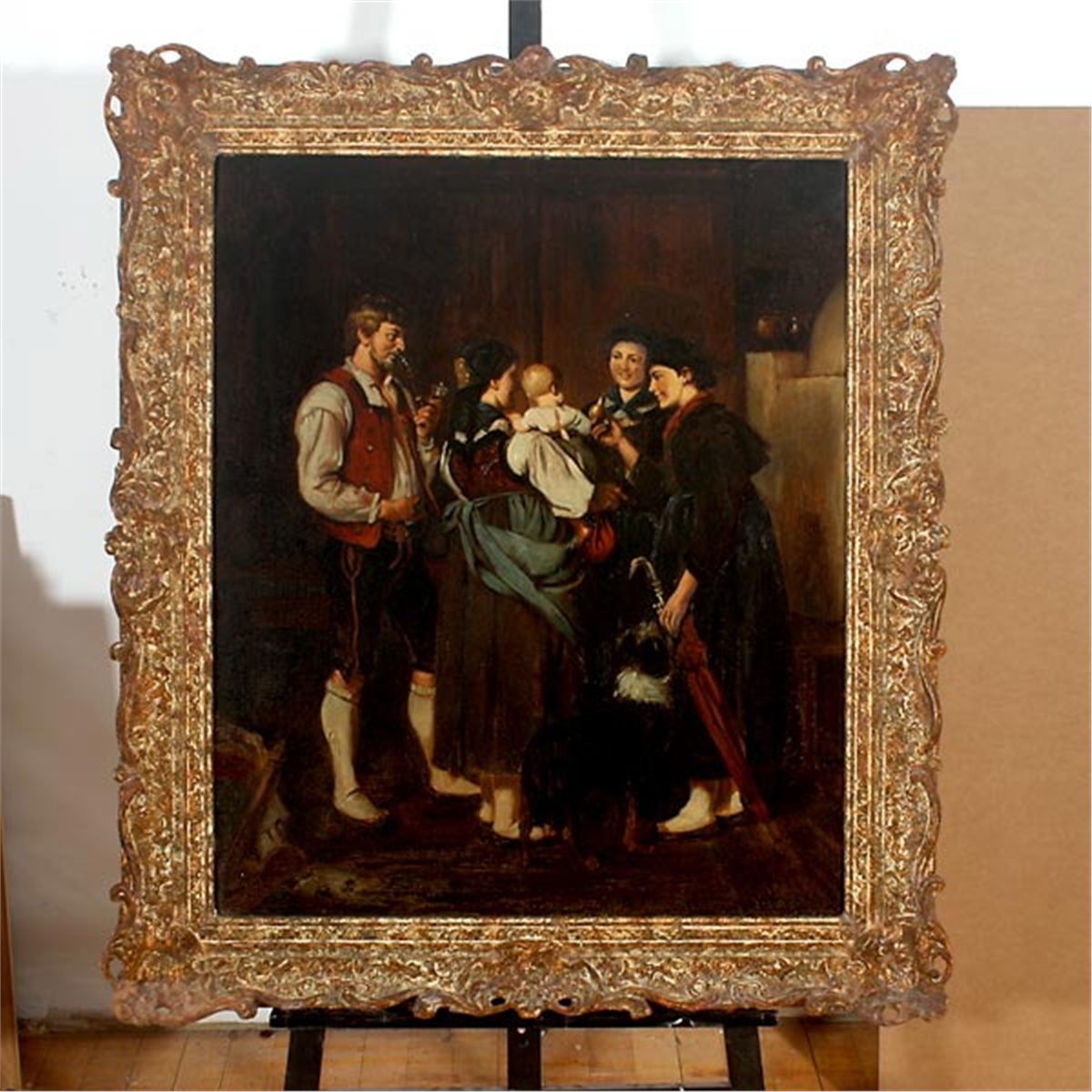 CONTINENTAL SCHOOL (Late 19th Century) Bringing in the New Baby Oil on canvas 30 x 25 inches/ 76.2 x 63.5 centimeters Frame: 37 x 32 inches/ 94 x 81.2 centimeters In good condition: Uniform Craquelure across surface from heat exposure.  Period frame showing repairs