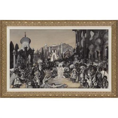 <B>CONTINENTAL SCHOOL</B></I><BR><I>The King with his Court</B></I><BR>Mixed media on paper<BR>12 x 19-1/2 inches (30.5 x 49.5 cm)<BR> <B>Condition Report:</B> Some minor tears at edges. Not examined out of frame.<BR><BR><b>Shipping:</b> Framed - with Glass, Small (<a target="_blank" href="http://www.heritageauctions.com/common/shipping.php">view shipping information</a>)