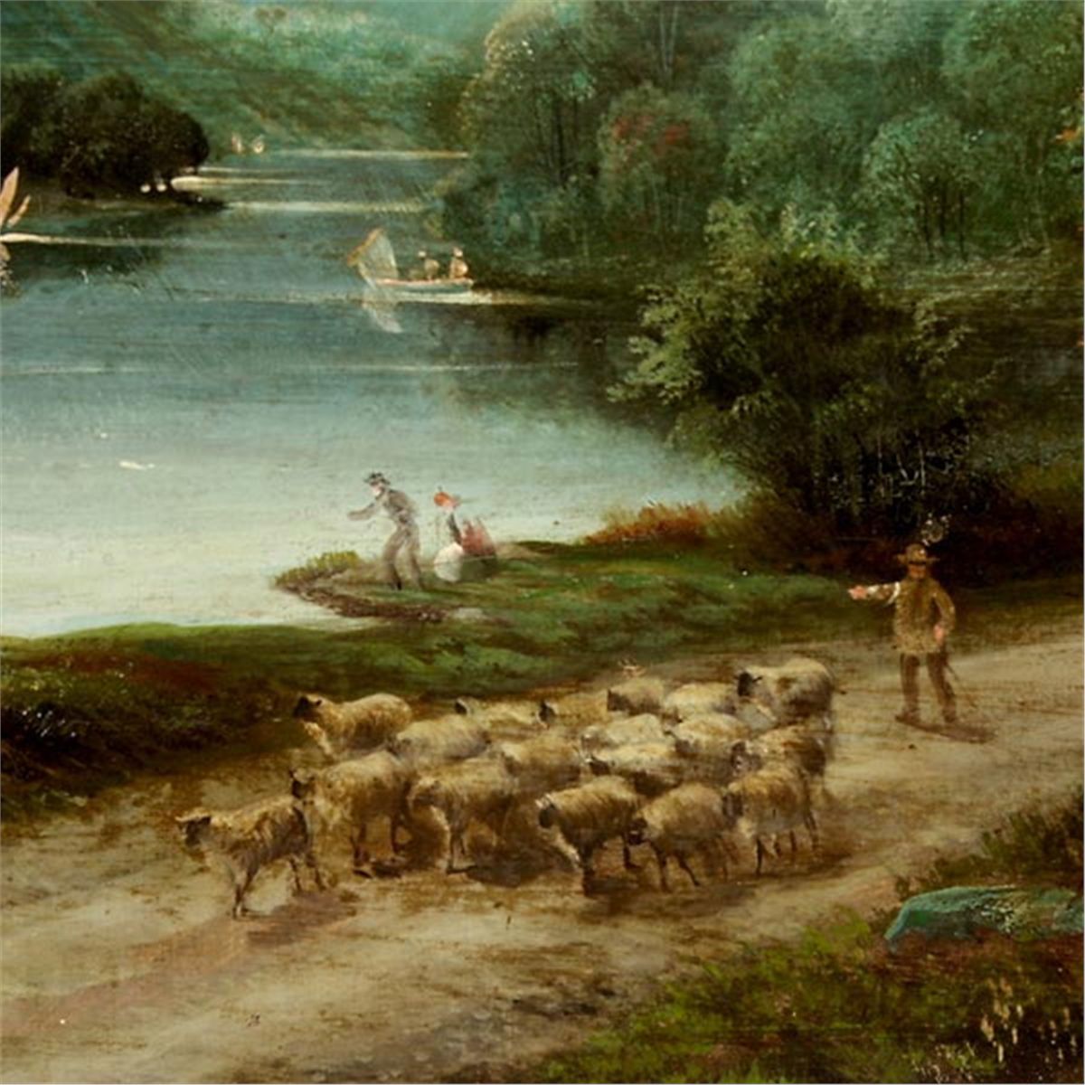 CONTINENTAL SCHOOL (19th Century) Sheep Herder Oil on canvas 20 x 30 inches/ 50.8 x 76.2 centimeters Illegibly signed lower center Frame: 24.75 x 34.75 inches/ 63 x 88.2 centimeters In good condition: relined and wax coating on canvas.  Framed