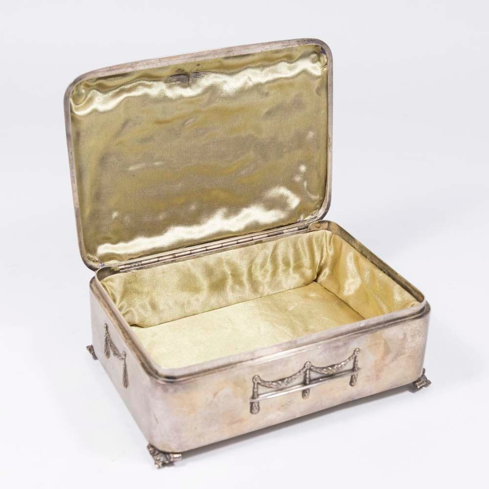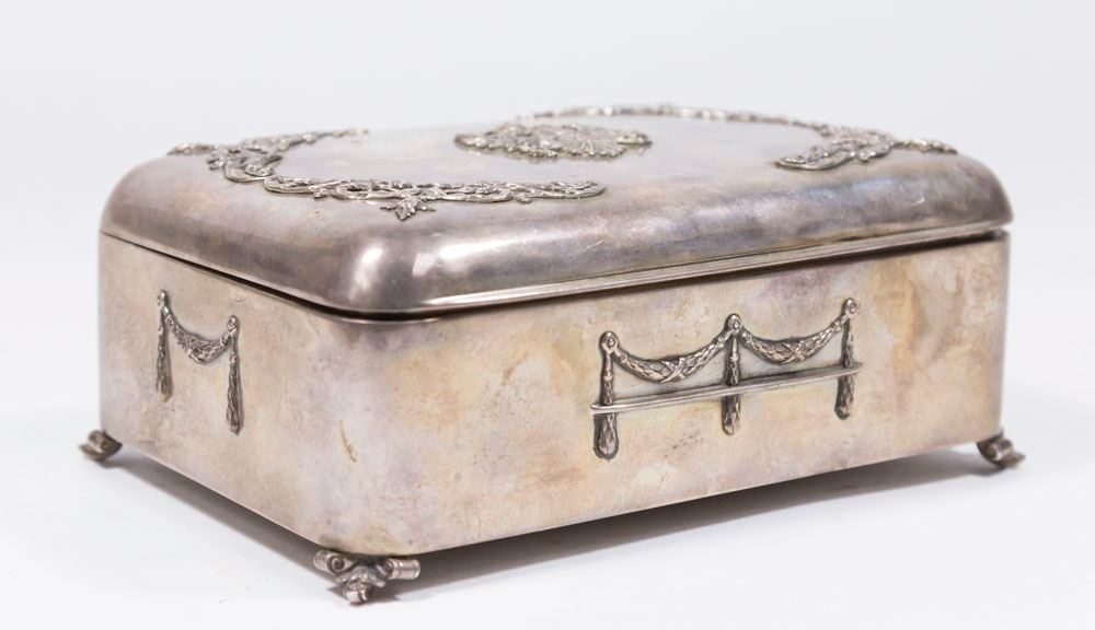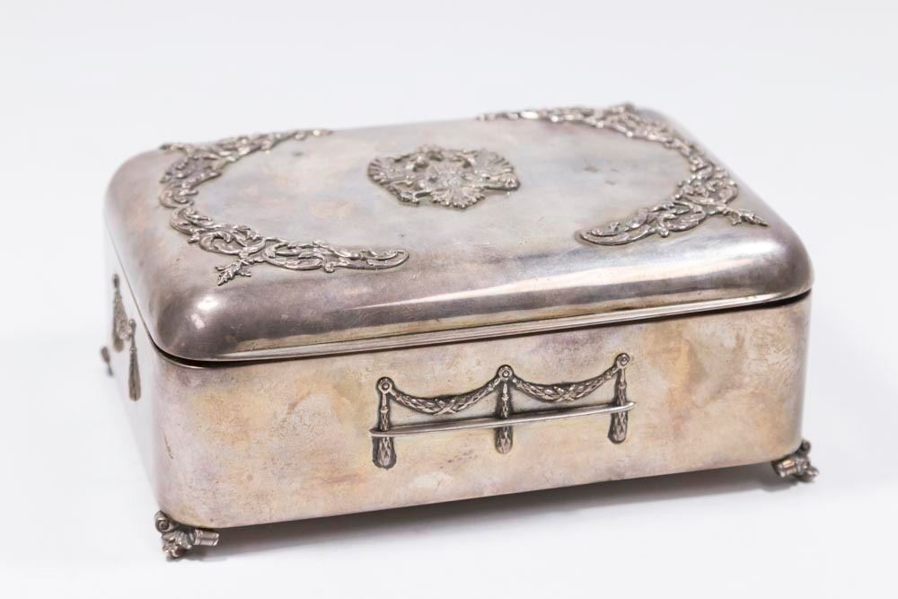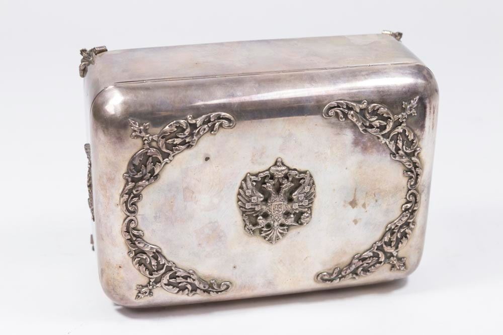 With double head eagle on top. Hallmarked on bottom. Wood interior. Approx. 3" H x 6 3/4" W x 4 3/4" D. (81)