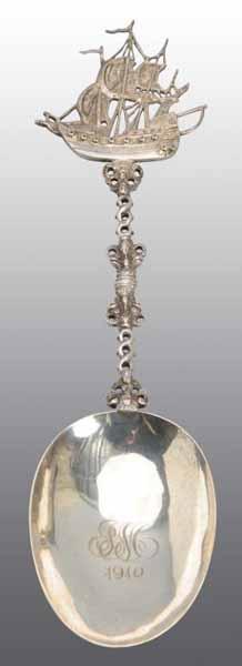 Description Dutch. Circa 1900. Weighs 4.9 troy ounces. The finial is cast in the form of a ship and above that is a pierced twist stem with plain bowl engraved with initials. Spoon is second standard and has key export marks. Condition (Very Good). Size 12 - 1/2" L.