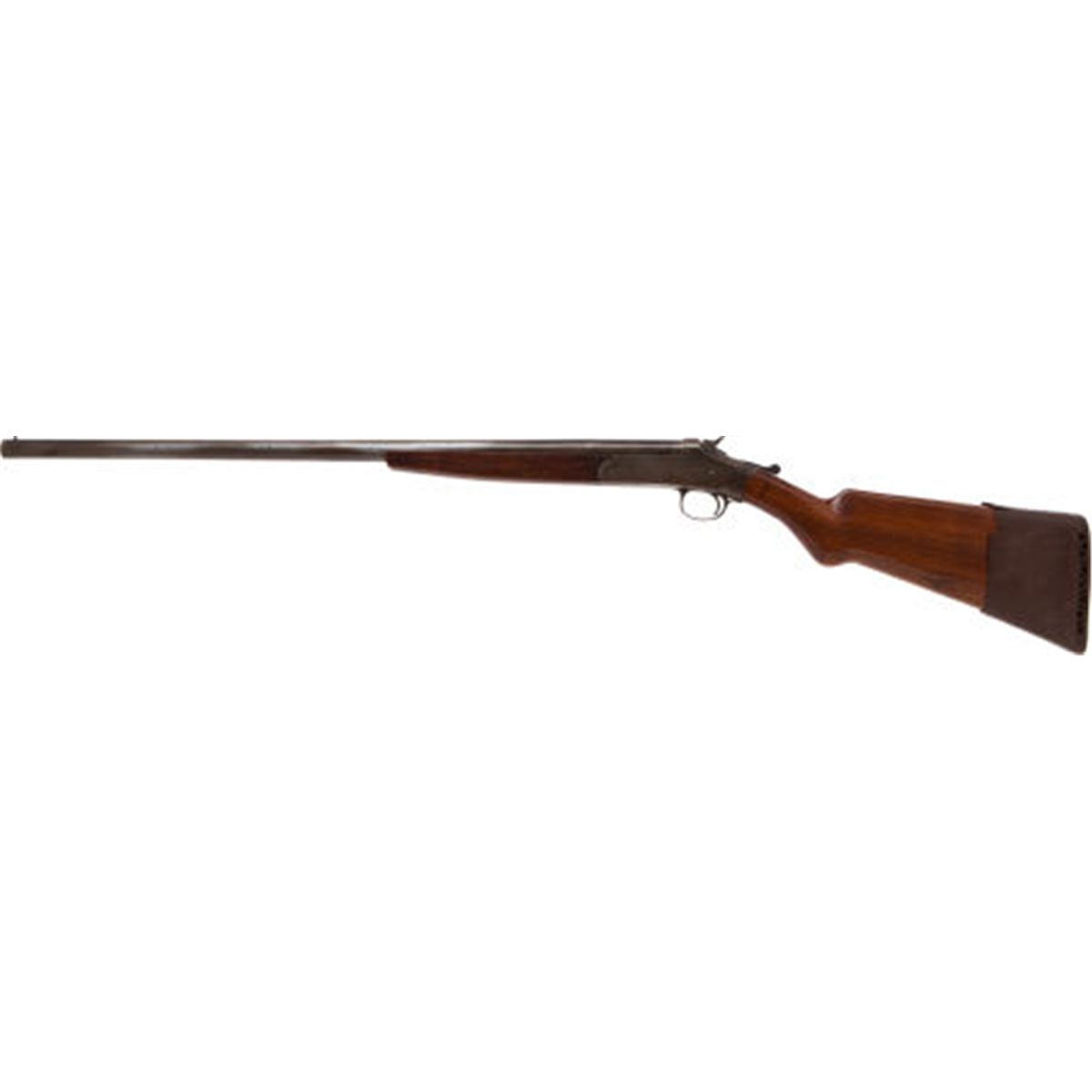Continental Single Shot Shotgun. Serial no. A186472, 16 gauge, 26 3/4-inch barrel with bead sight. Blued finish. Tang-mounted thumb activated barrel latch. Gun dated 1916 on left side of frame. Pistol-grip walnut stock and fore-end. Brown rubber boot and integral recoil pad. Condition: Fair to good. Metal polished and showing scattered traces of finish. Wood refinished and showing chip repair to wrist. Action good. NRA FIREARMS FOR FREEDOM PROGRAM