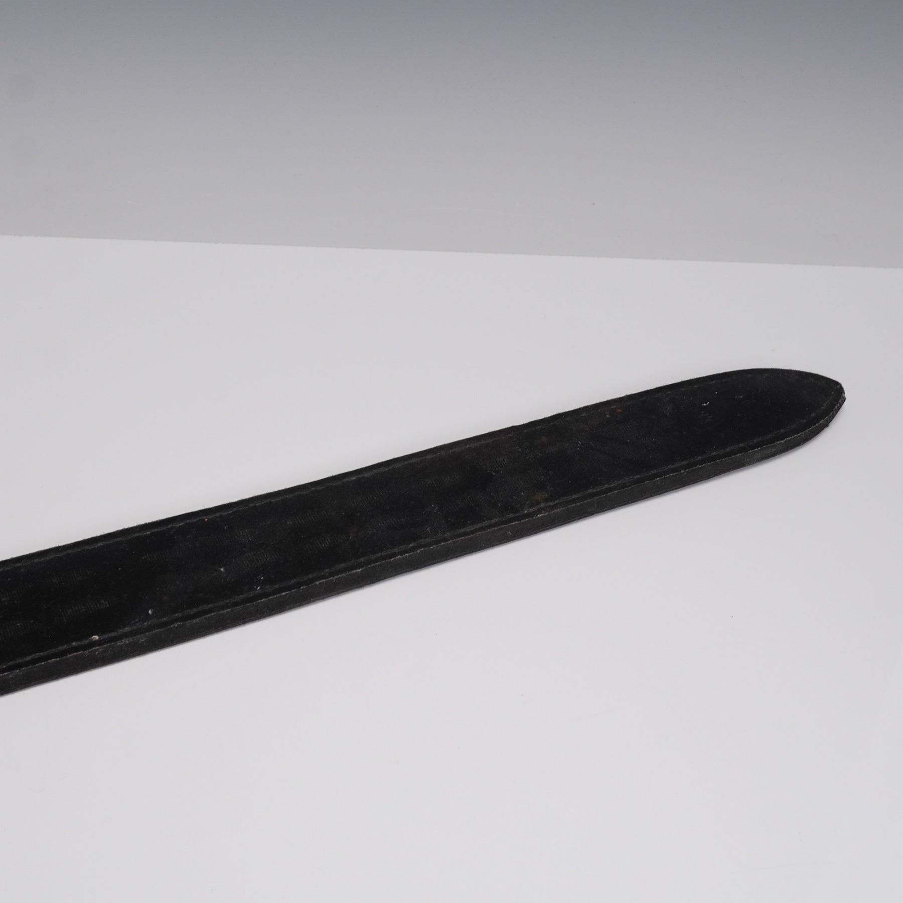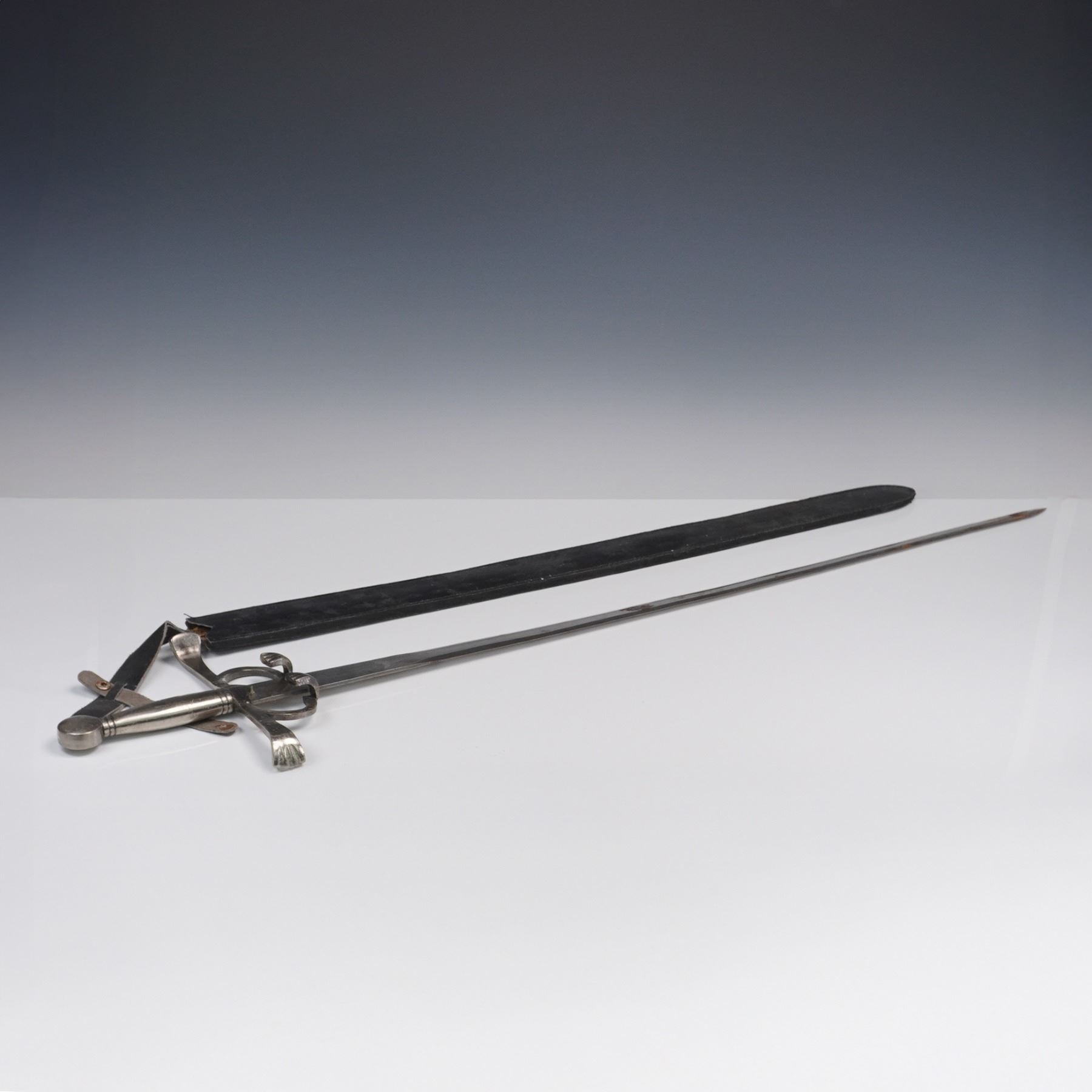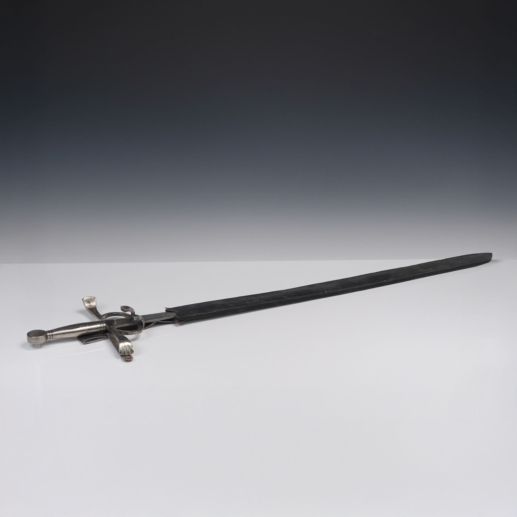 An imposing and elegantly balanced continental-style basket-hilted sword, featuring a long, narrow steel blade exhibiting age-commensurate oxidation and patina, paired with an intricately formed hilt incorporating scrolling knuckle guards and shell-like terminals for hand protection. The steel grip is shaped for optimal handling, terminating in a stout pommel. Housed in its original black leather scabbard, which includes a functional belt strap and buttoned enclosure, this weapon evokes the drama and prestige of 17th-century European swordsmanship. A striking addition for any collector of arms and armor, historical reenactor, or decorative arts enthusiast.