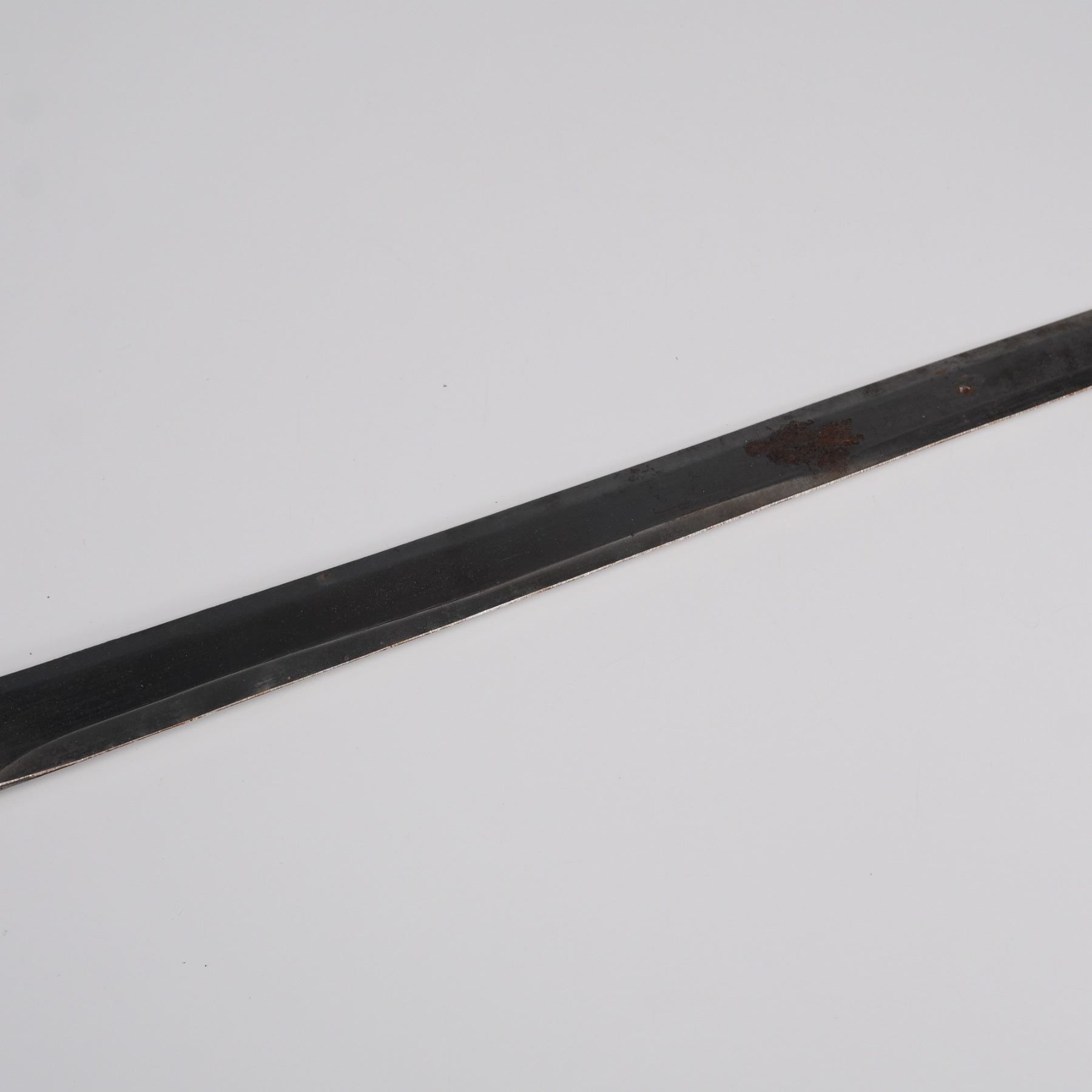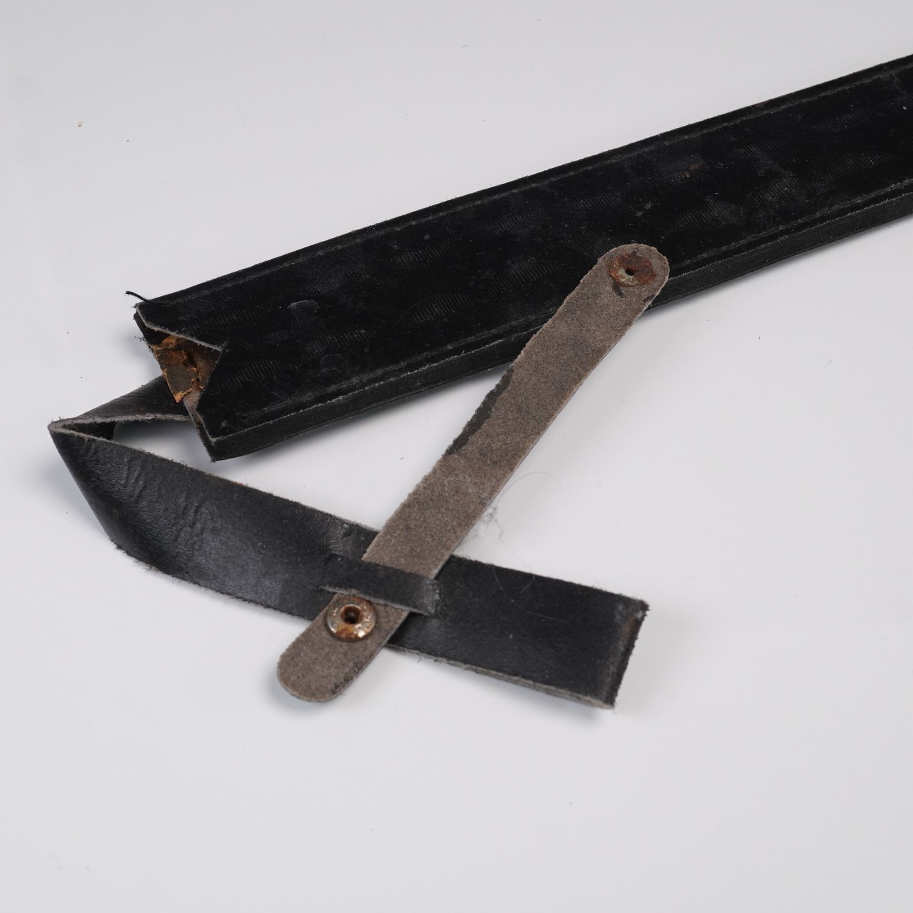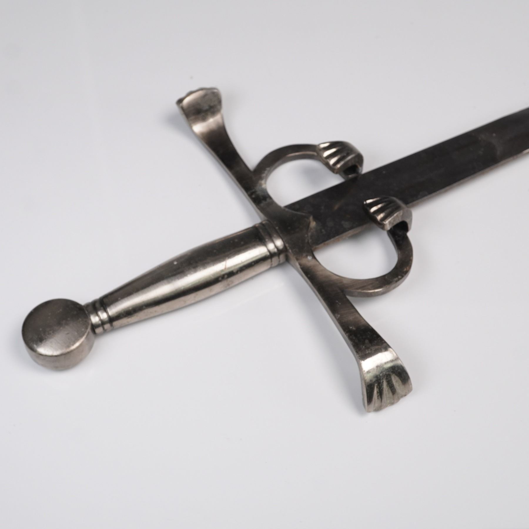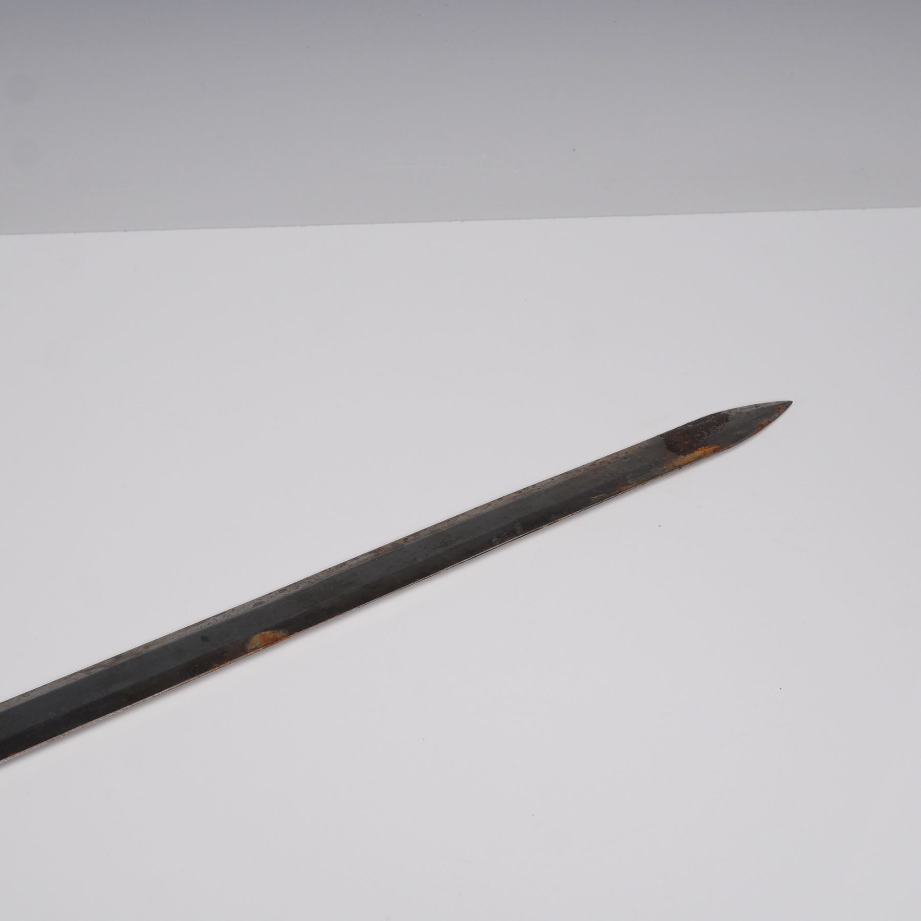 An imposing and elegantly balanced continental-style basket-hilted sword, featuring a long, narrow steel blade exhibiting age-commensurate oxidation and patina, paired with an intricately formed hilt incorporating scrolling knuckle guards and shell-like terminals for hand protection. The steel grip is shaped for optimal handling, terminating in a stout pommel. Housed in its original black leather scabbard, which includes a functional belt strap and buttoned enclosure, this weapon evokes the drama and prestige of 17th-century European swordsmanship. A striking addition for any collector of arms and armor, historical reenactor, or decorative arts enthusiast.