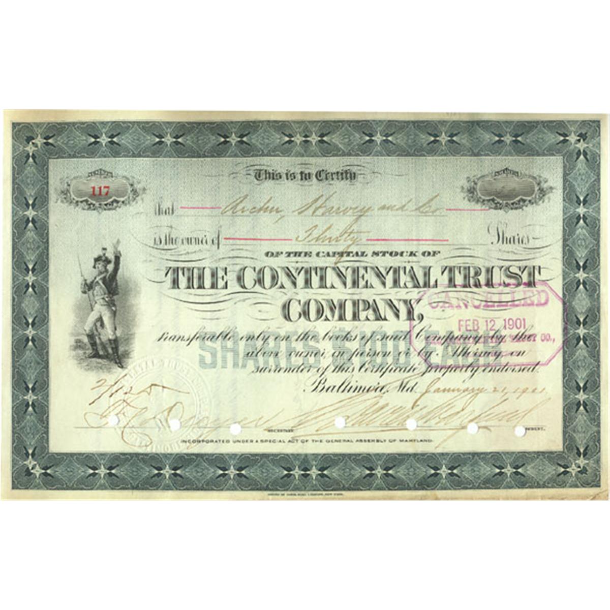 1901, Maryland. Stock certificate for 5 shares. Black/Blue. Engraved vignette of a minuteman at left. Stamp and punch cancelled and very fine.