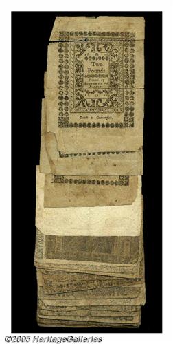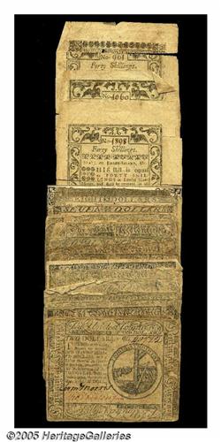 <B>Continental and Colonial Group Lot.</B></I> This lot consists of 15 Continentals mostly in <B>VG</B></I> or so, with one note split in half and another backed. Massachusetts has two notes included in this lot, a $7 and a $8 from the May 5, 1780 issue, both <B>Fine,</B></I> COC. Pennsylvania is represented by one Colonial, a 2s/6d from Oct 1, 1773 in <B>VG.</B></I> Rhode Island has three notes in this mix, and they are from the May 1786 issue grading <B>VG</B></I> or so. They include a 30s and two 40s, with one of the 40s having the top 20% detached, but present. The final note in this lot is a French 1792 5 Livres Pick A60 <B>XF,</B></I> corner clipped.<BR>