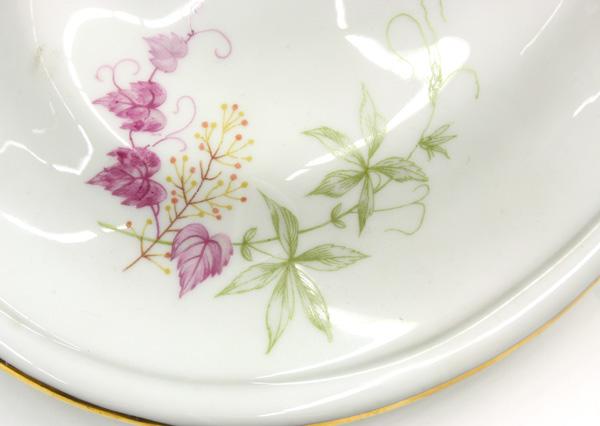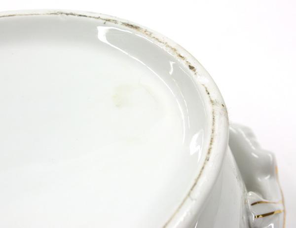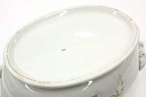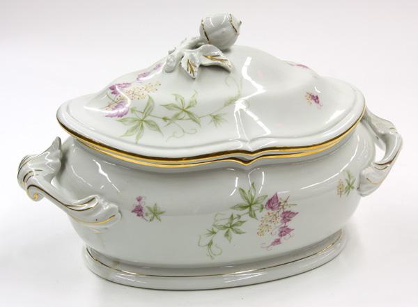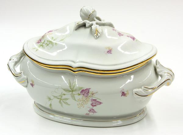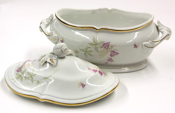 Continental covered porcelain tureen, having gilt highlights and floral reserves, marked with underglaze green wave mark, 8.5''h x 14''w