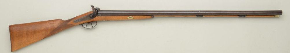 Continental double barrel percussion shotgun, circa about 1860s, 12 gauge, 32" barrels, 48-1/2" overall, choked improved cylinder right, modified left. Barrels show most of their original brown and are marked laminated steel, 50% case hardening on locks; stock good to very good, locks working well, right hammer screw sheared. The barrels show about half of their Damascus pattern. Good to very good overall. Est.: $300-$600