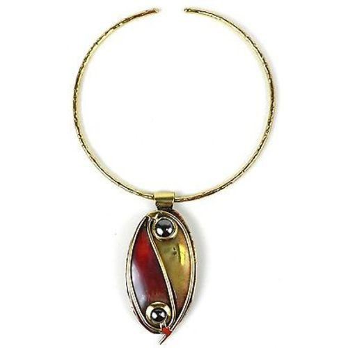 Continuity Hematite, Copper and Brass Pendant Necklace **|**|** Two hematite stones are swept into a swirl of polished brass on this copper and brass pendant handmade by South African artisans. The coloration of the metal is achieved by applying high heat on this 3-inch long pendant that hangs from a hammered hoop.Necklace dimensions: 2 mm wide x 13 inches long plus a 2-4-inch gap. #PEN-933-210064