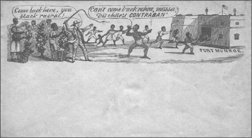 Contraband Envelope. Depicting slaves running toward Fort Monroe, the Union-held fortress. Gen. Butler had declared that any slave within jurisdiction of the Fort was to be considered as "contraband" of war, and no longer property of the slaveowner. Postally unused Civil War patriotic cover. Toned, else fine.