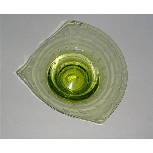This console dish was originally a square shaped, solid, and controlled "bubble within the glass" work of art. Then the glass blower rounded its sides and pulled its corners into a skewed square! (Or, is that now a funny triangle??!!) As with the "Figure 8" vase described in Item GL-130107, the square shape on the top of the bowl then vies with the "normal" bottom for the viewer's perception.<p>