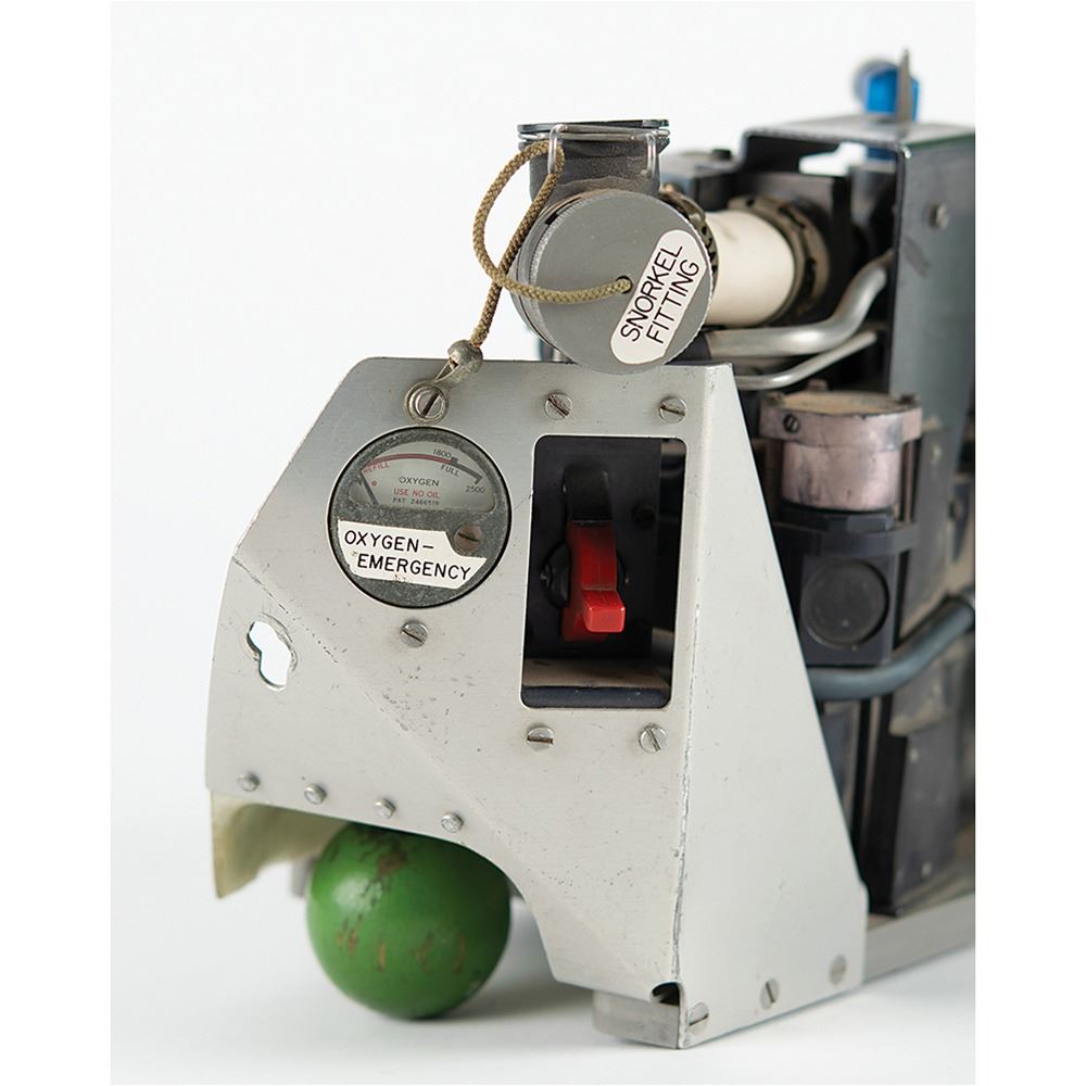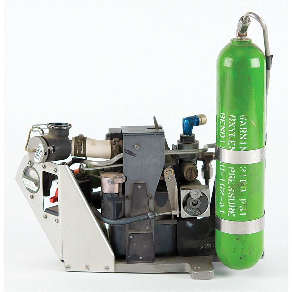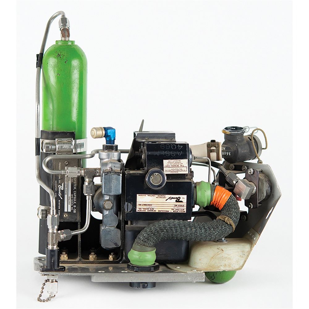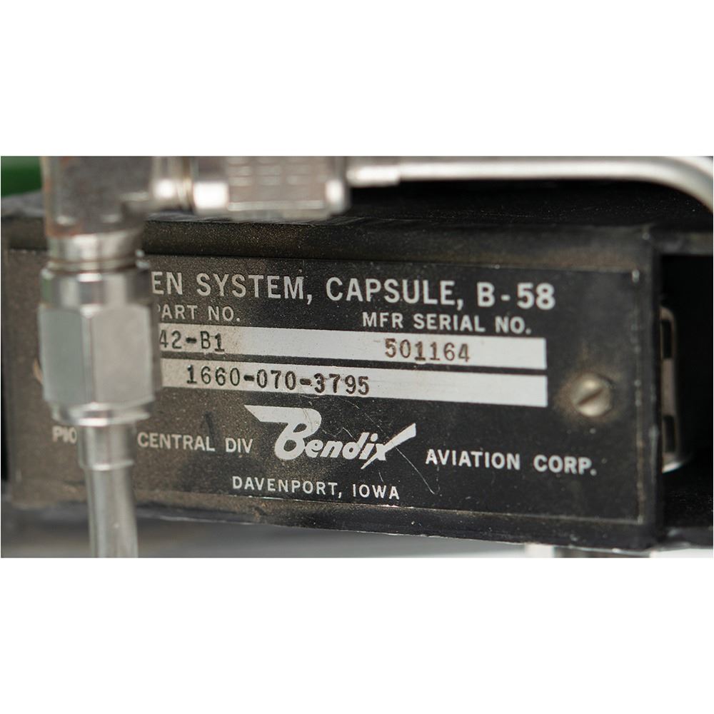 Scarce emergency oxygen system built for the Convair B-58 Hustler crewmember escape capsule, measuring approximately 11Ë x 6Ë x 11.5Ë, comprising several Bendix components in their original assembly. Includes the oxygen system capsule, pressure regulator, snorkel fitting, recharge port, and emergency oxygen gauge. In fine condition.