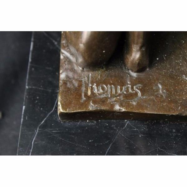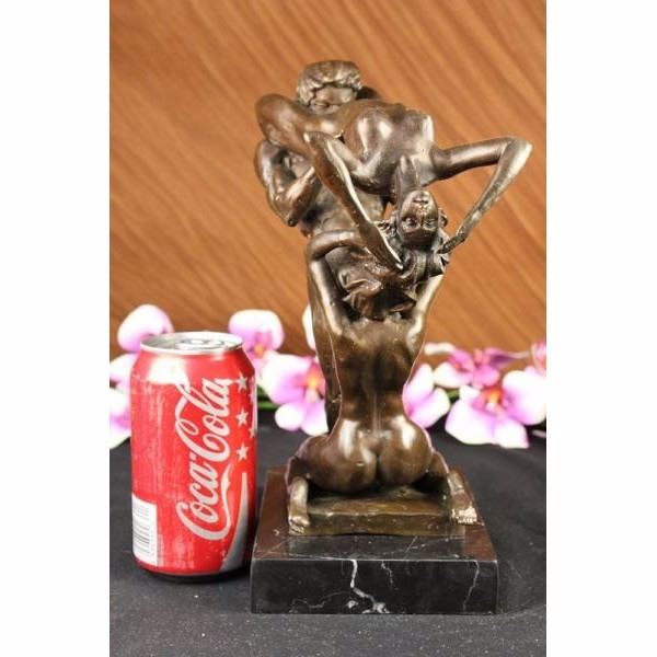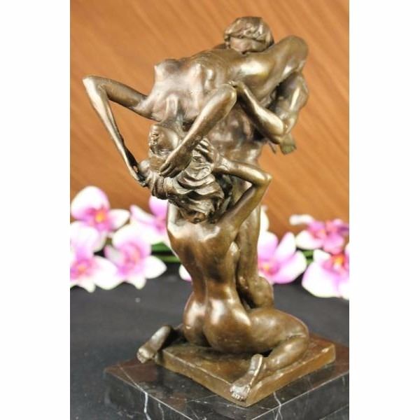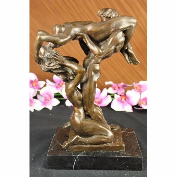 This little number will make anyone blush but yet keep the conversation going. This unforgettable 3-some among two woman and a man will leave anyone shocked. One girl is sitting between her legs with her buttocks touching the floor, while she goes down on her erotic male friend and holds her other partners head up. He is carrying his other female companion on his shoulder while she squeezes her thighs tight and caresses her head uncontrollably, caused by the pleasure she is receiving from his tongue.This marvelous sculpture shows every different cuts and lines on their bodies. The handmade bronze sculpture was cast using the age-old method of lost-wax casting and stained with a brown patina for preservation. It is mounted upon a black marble base with the European Bronze Finery stamp of quality and the artist Thomas's signature. Condition: This sculpture is perfect condition. Bronze Dimensions with Marble Base:Height 11" x Width 6 1/2" Marble Dimensions: 5" X 6 1/2". Height without base: 10" Weight : 11 LBS Inventory : 29X12264992