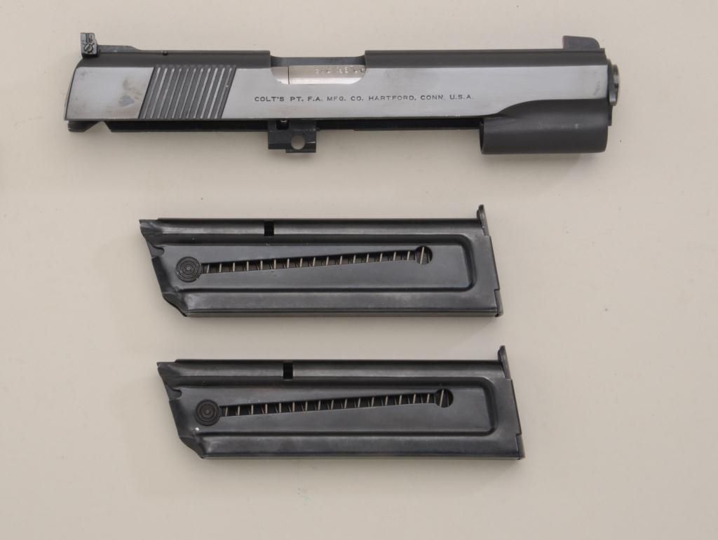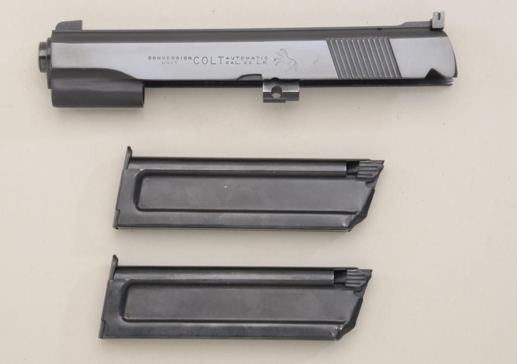 Conversion unit for Colt Government Model to .22 LR cal., 1970's-80s production, blued finish in wood grain box with 2 Colt marked clips and all small parts; shows some slight use, 96-99%. Est.: $250-$500