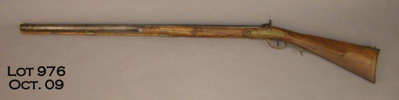 Converted J. Henry half stocked percussion rifle, .58 cal., 32” half round, half octagon barrel. This old warrior is in overall fair condition with lots of character; the metal surfaces show a brown patina with scattered erosions and extrafront barrel key for the sight. The trigger guard, butt plate and patchbox are brass, the wood stock has been cracked and broken in several places with old repairs, there is a wood ram rod present with one brass ferule; the stock also has a pewte fore tip. A classic early gun with interesting “US” marking on top flat of barrel at breech that deserves further research. Est.: $750-$1,500.