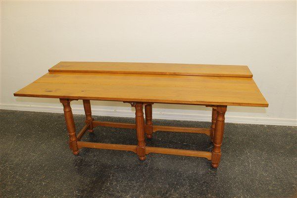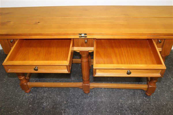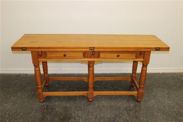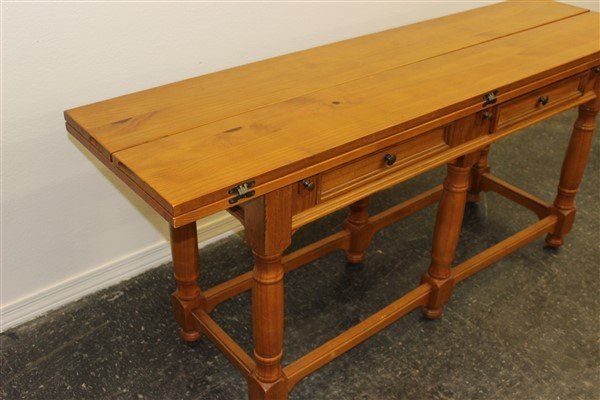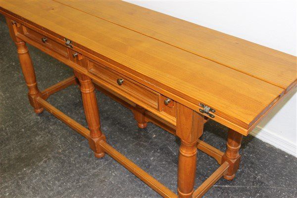 can be used as a server or as a sofa table, or dining table, has 6 legs well braced , and 2 drawers, approx 72" long x 32" tall x 20" deep, with leaves folded out approx 40" wide