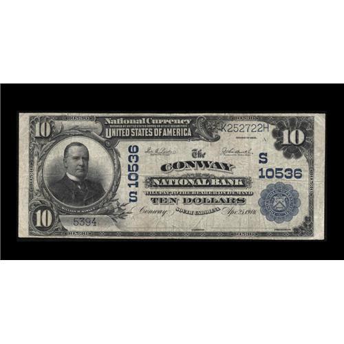 <B>Conway, SC</B></I> - $10 1902 Plain Back Fr. 631 <B>The Conway NB</B></I> Ch. # (S)10536<BR>An elusive Horry County issuer we expect will strain friendships in the South Carolina collecting fraternity before the hammer falls tonight. The published Kelly census includes only six large notes from here. Tonight's offering is a solid <B>Fine+</B></I> with more than ample margins and more than its share of eye appeal. With the popularity of scarce Nationals at a near fever pitch, our estimate may prove conservative when bidding concludes.