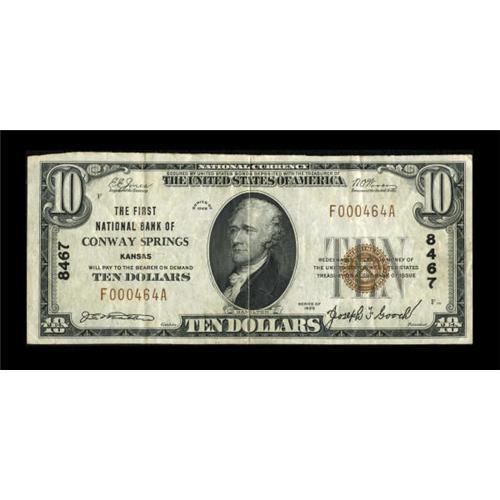 <B>Conway Springs, KS</B></I> - $10 1929 Ty. 1 <B>The First NB</B></I> Ch. # 8467<BR> A very tough note from the only bank to issue in this small Sumner County community. Sharp <B>Very Fine-Extremely Fine.</B></I><BR><I>From The J.S. Weber Collection.</B></I><BR><BR><b>Shipping:</b> Coins & Currency (<a target="_blank" href="http://www.heritageauctions.com/common/shipping.php">view shipping information</a>)