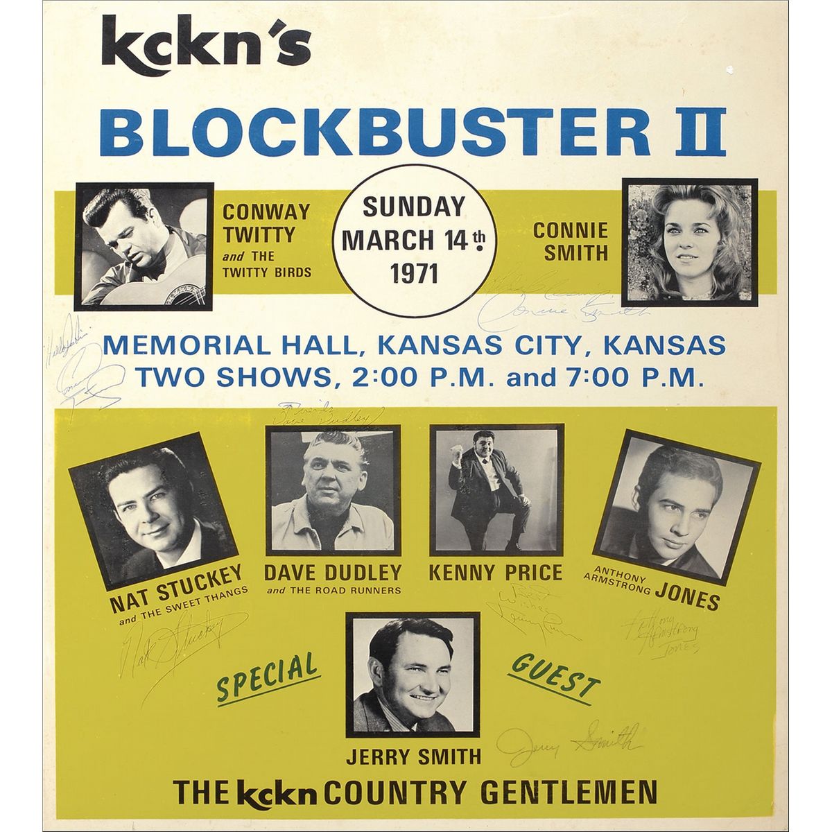 Color 22 x 26 poster for KCKN’s Blockbuster II held on Sunday, March 14, 1971, at Memorial Hall in Kansas City, Kansas, signed in blue ballpoint by Conway Twitty, adding a brief inscription, Connie Smith, Nat Stuckey, Dave Dudley, Kenny Price, Anthony Armstrong Jones, and in black felt tip by Jerry Smith. Scattered light toning and foxing, and some light corner creasing, otherwise fine condition. Oversized.