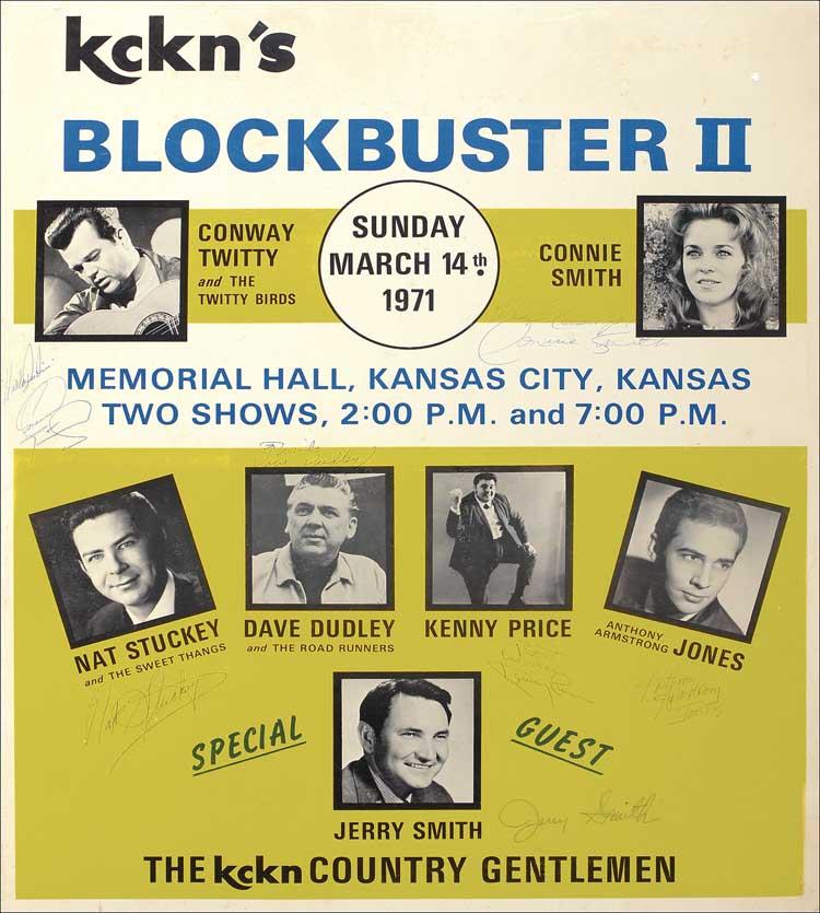 Color 22 x 26 poster for KCKN’s Blockbuster II held on Sunday, March 14, 1971, at Memorial Hall in Kansas City, Kansas, signed in blue ballpoint by Conway Twitty, adding a brief inscription, Connie Smith, Nat Stuckey, Dave Dudley, Kenny Price, Anthony Armstrong Jones, and in black felt tip by Jerry Smith. Scattered light toning and foxing, and some light corner creasing, otherwise fine condition. RRAuction COA.