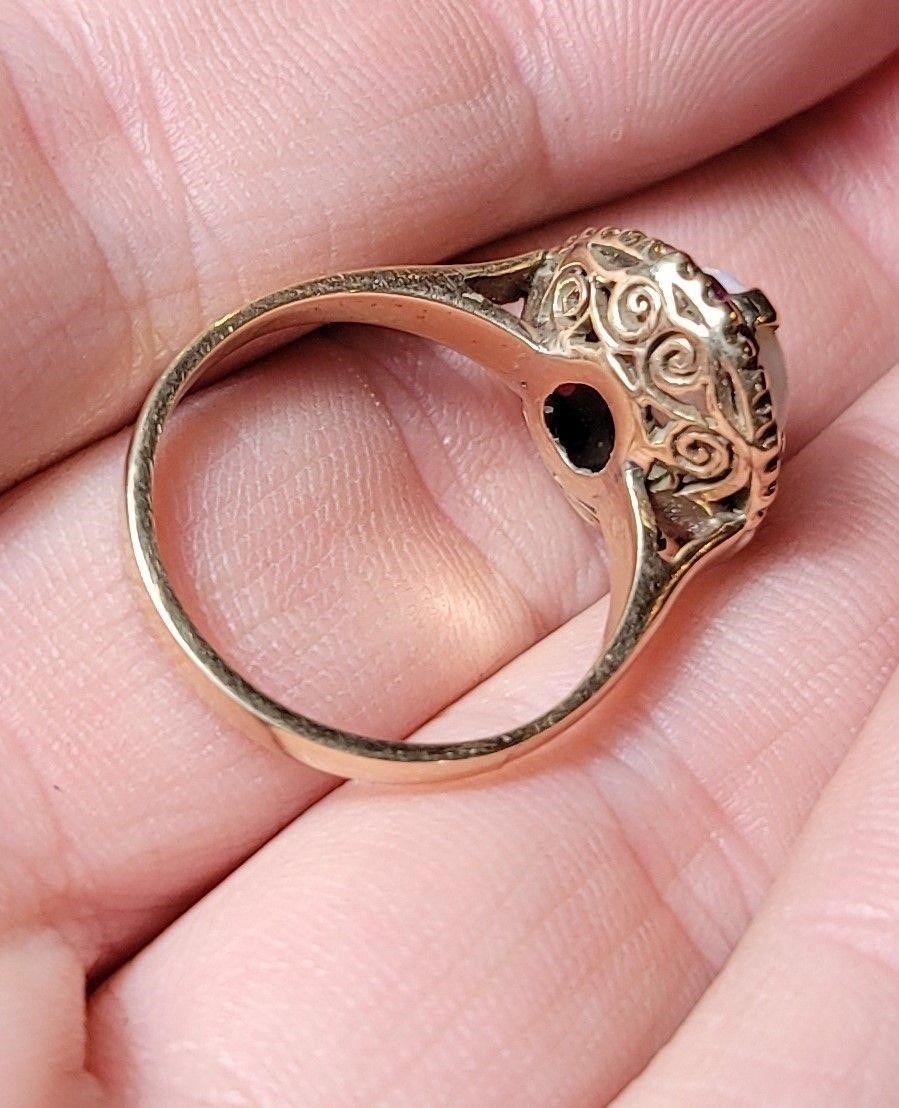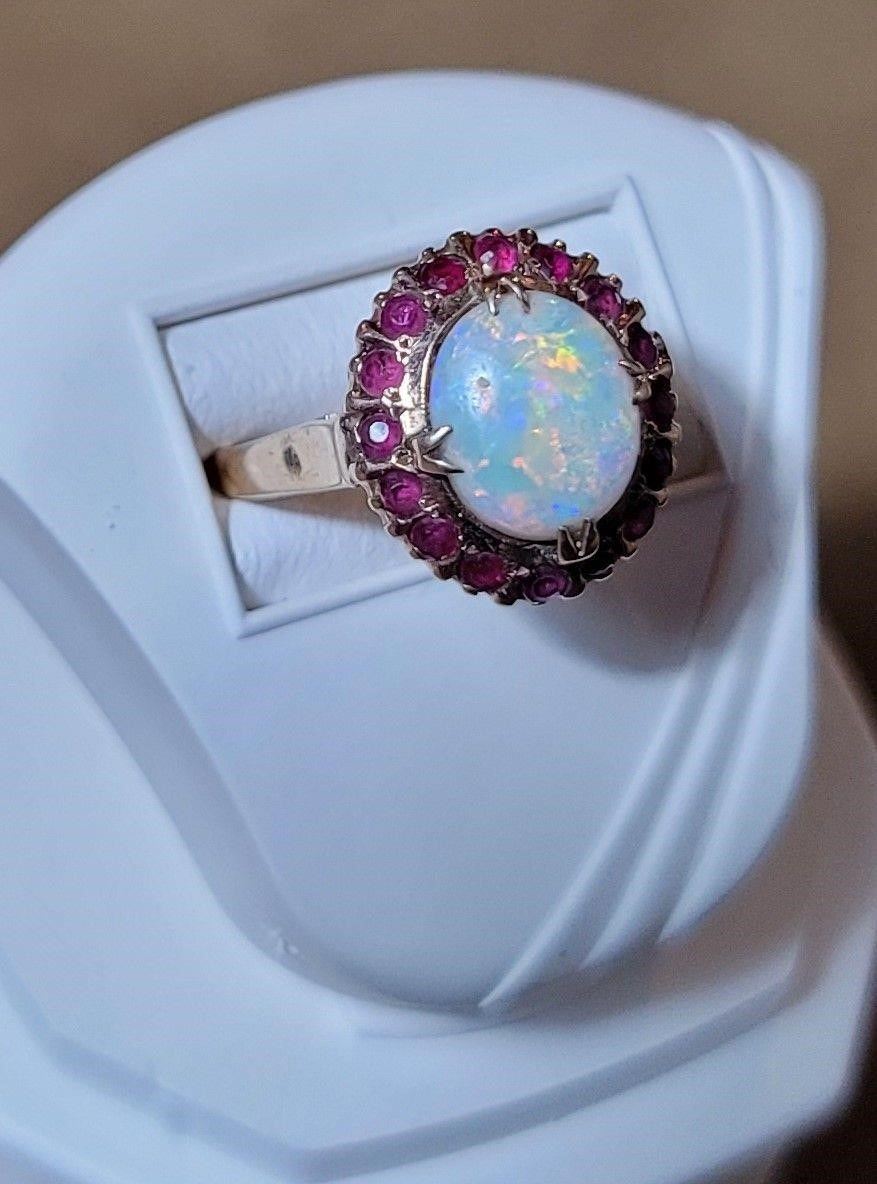 18k yellow gold. Set with a large cabochon Coober Pedy Natural Fire Opal. Surrounding the opal are natural rubies. Very nice ring. 5.03 grams total weight.
