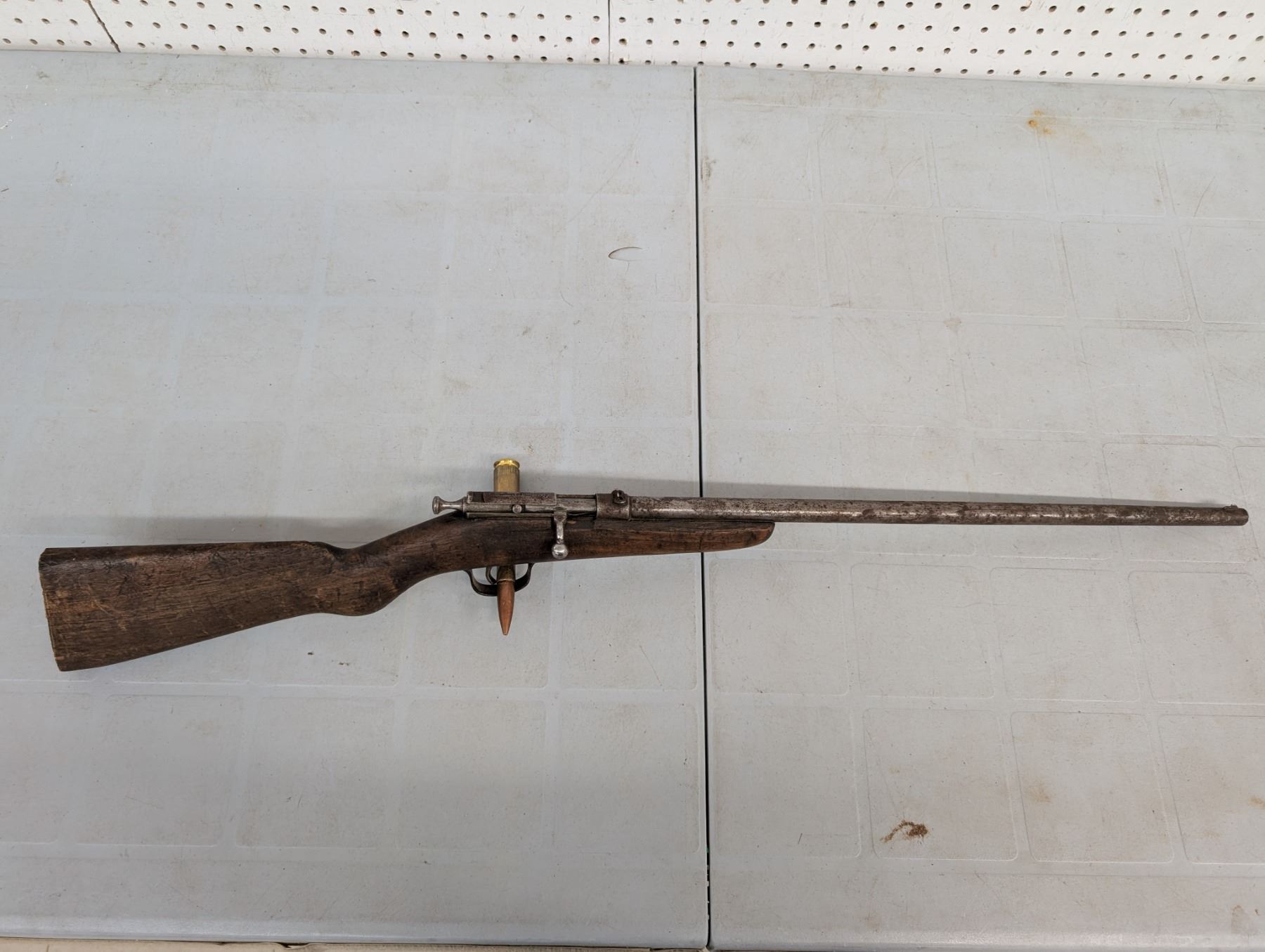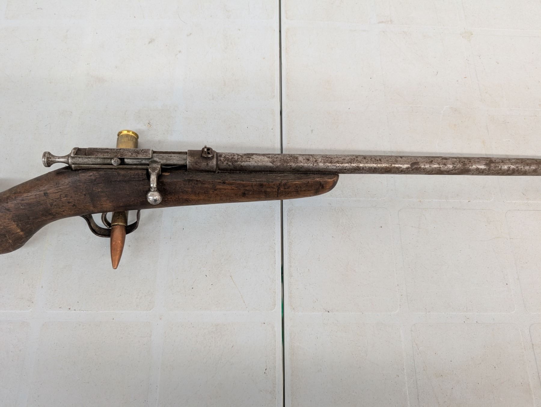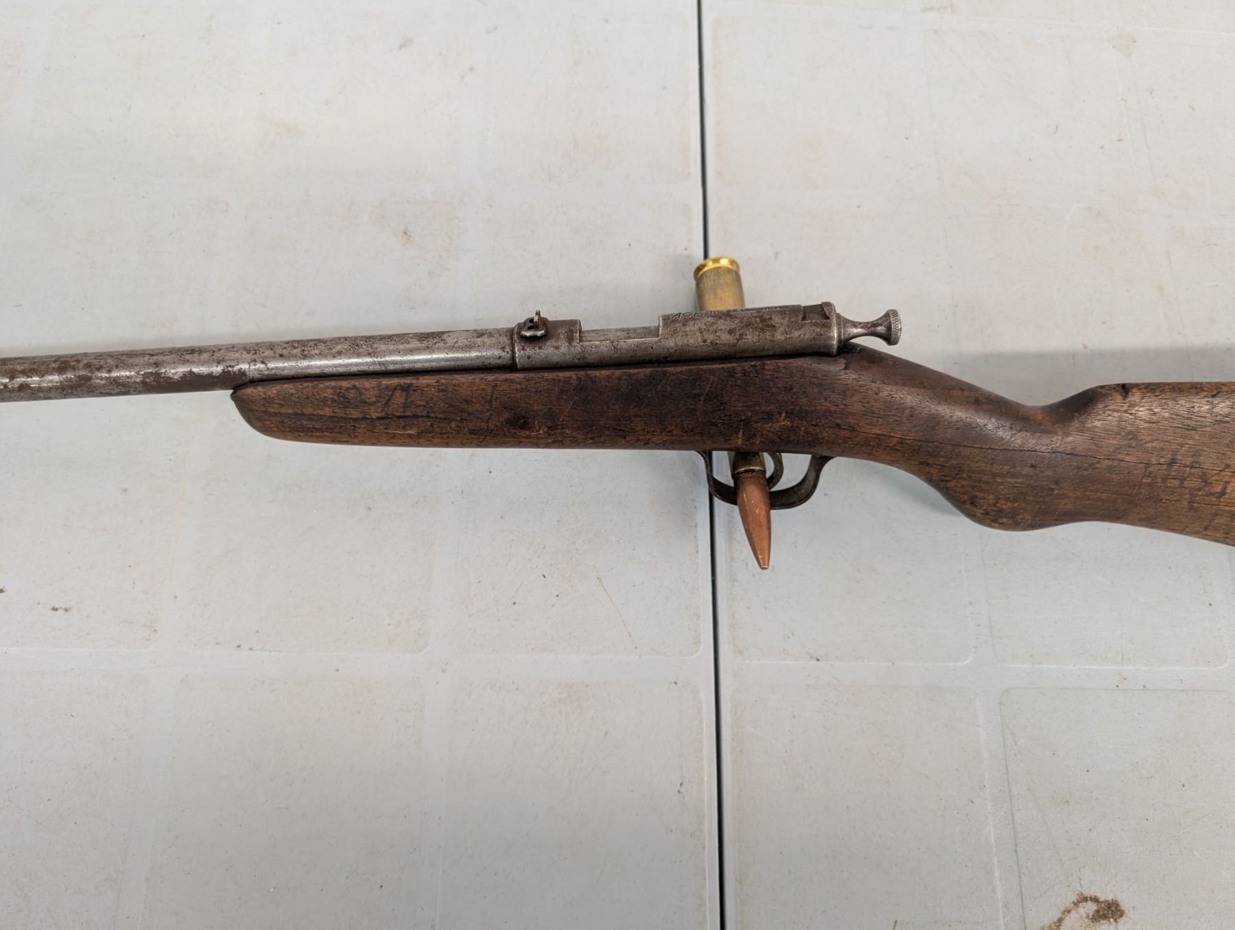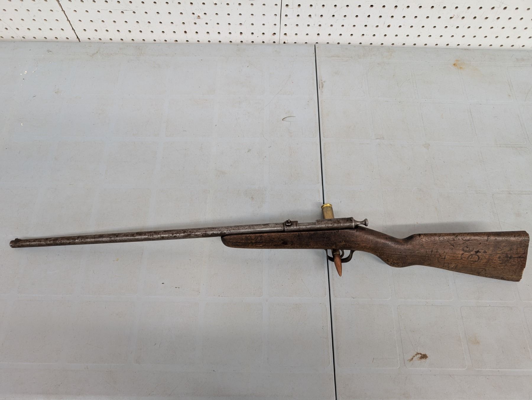 Bolt action single shot, Bore is shiny with lots of rifling, Action functions well, no retained finish , Stock has been shortened and has a piece missing ahead of teh bolt.