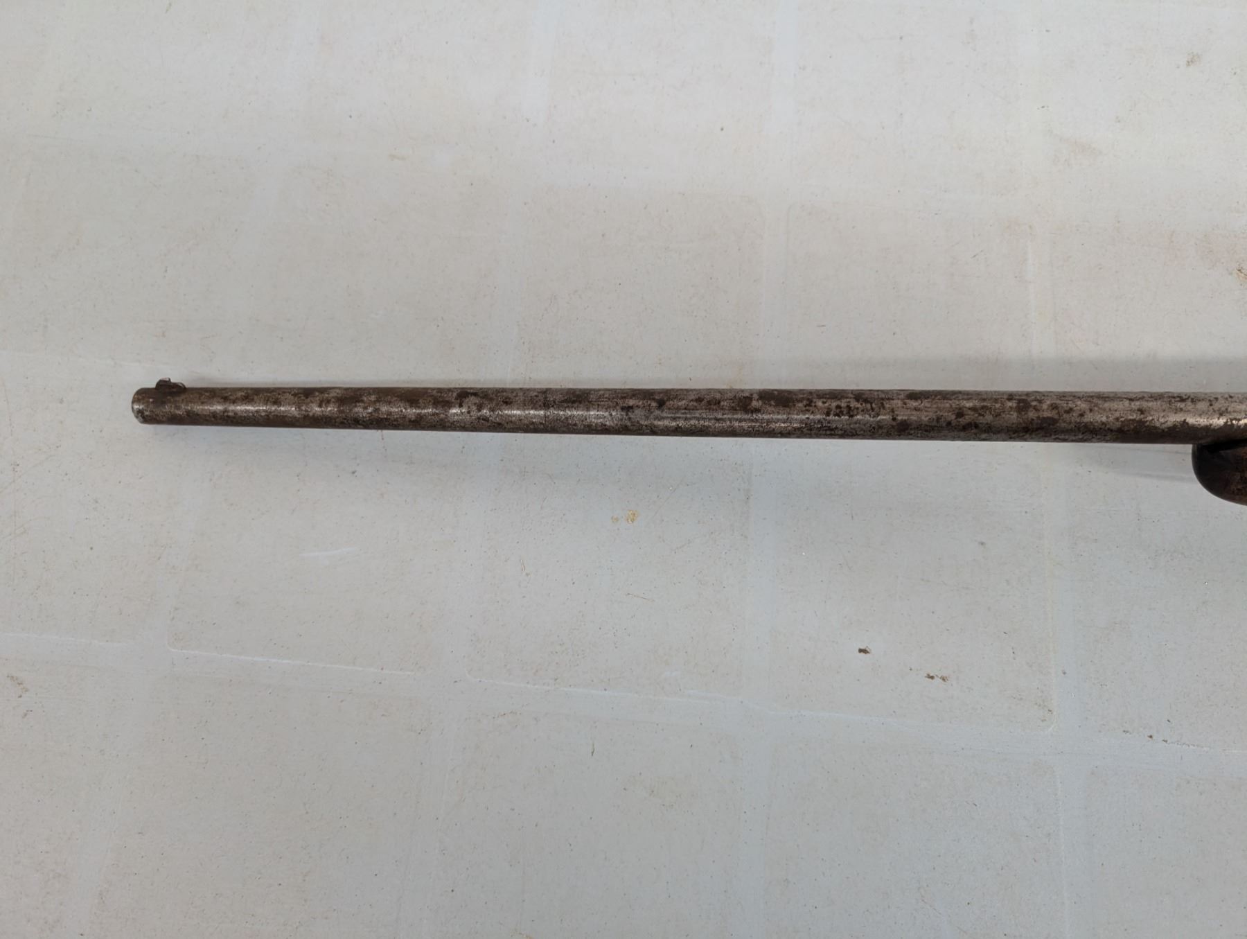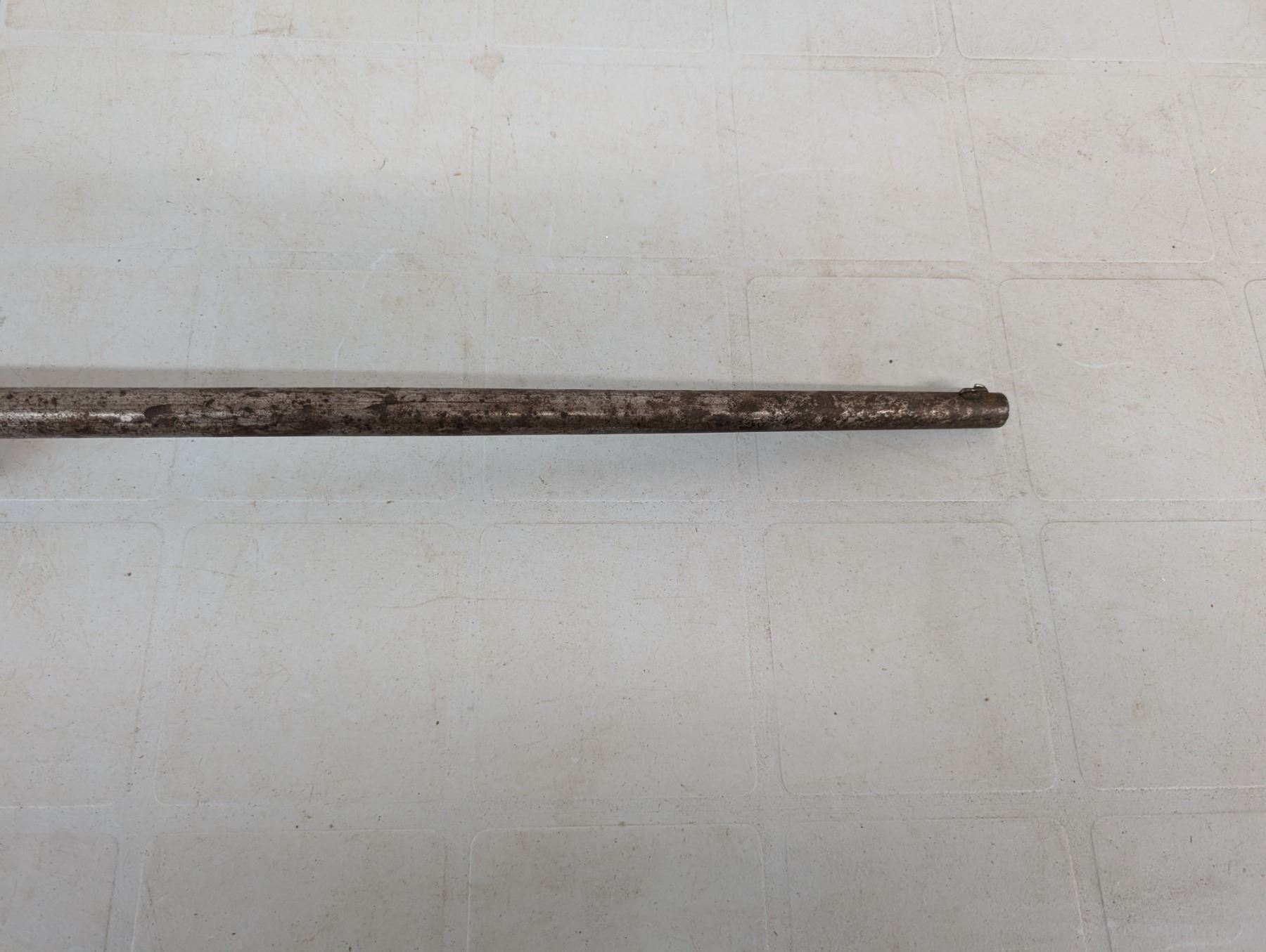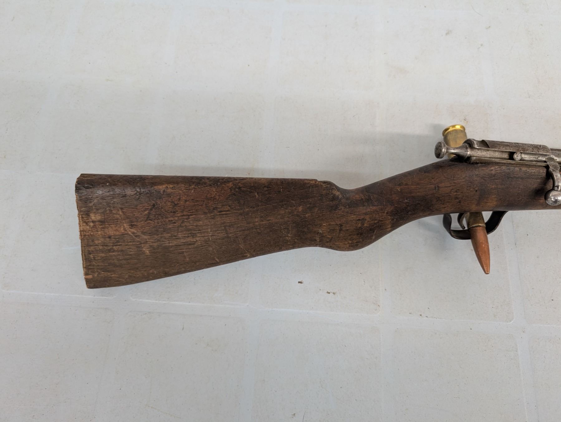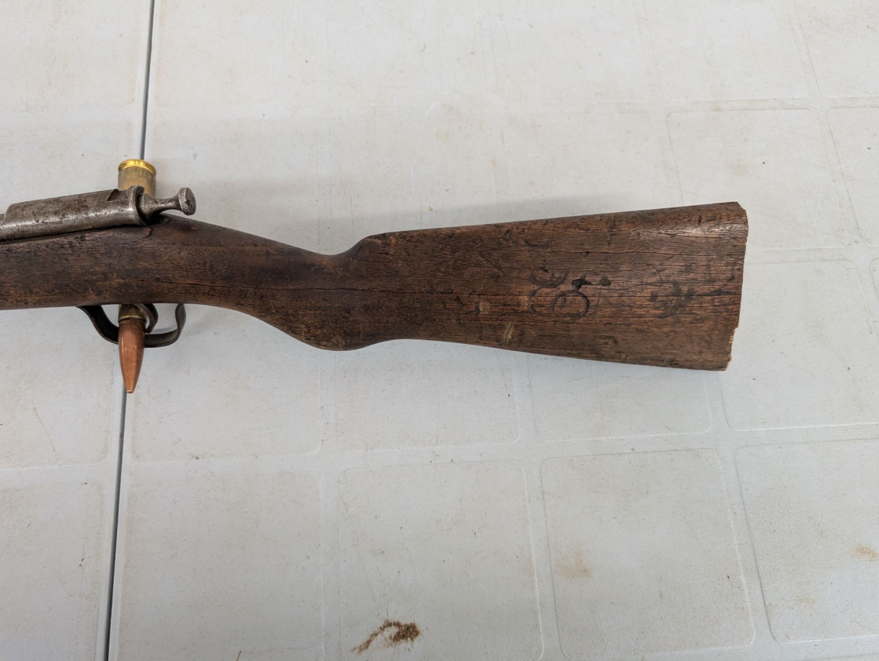 Bolt action single shot, Bore is shiny with lots of rifling, Action functions well, no retained finish , Stock has been shortened and has a piece missing ahead of teh bolt.