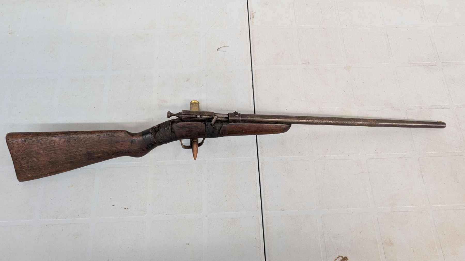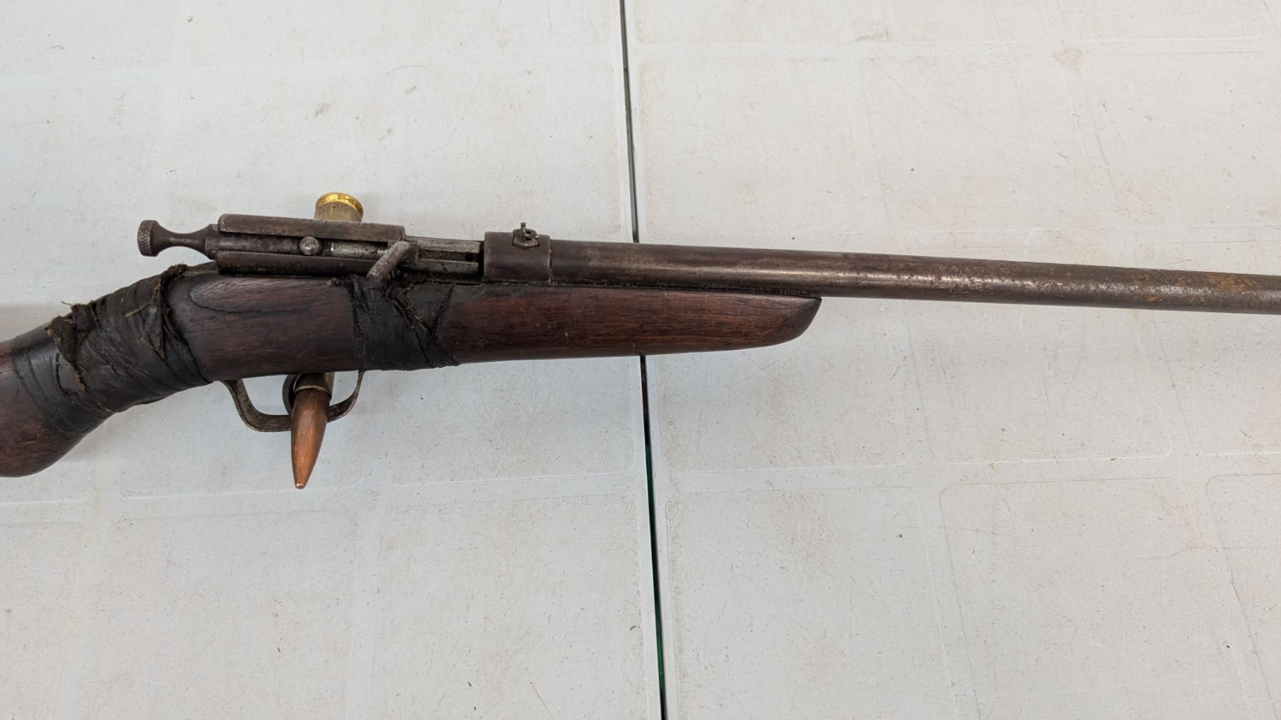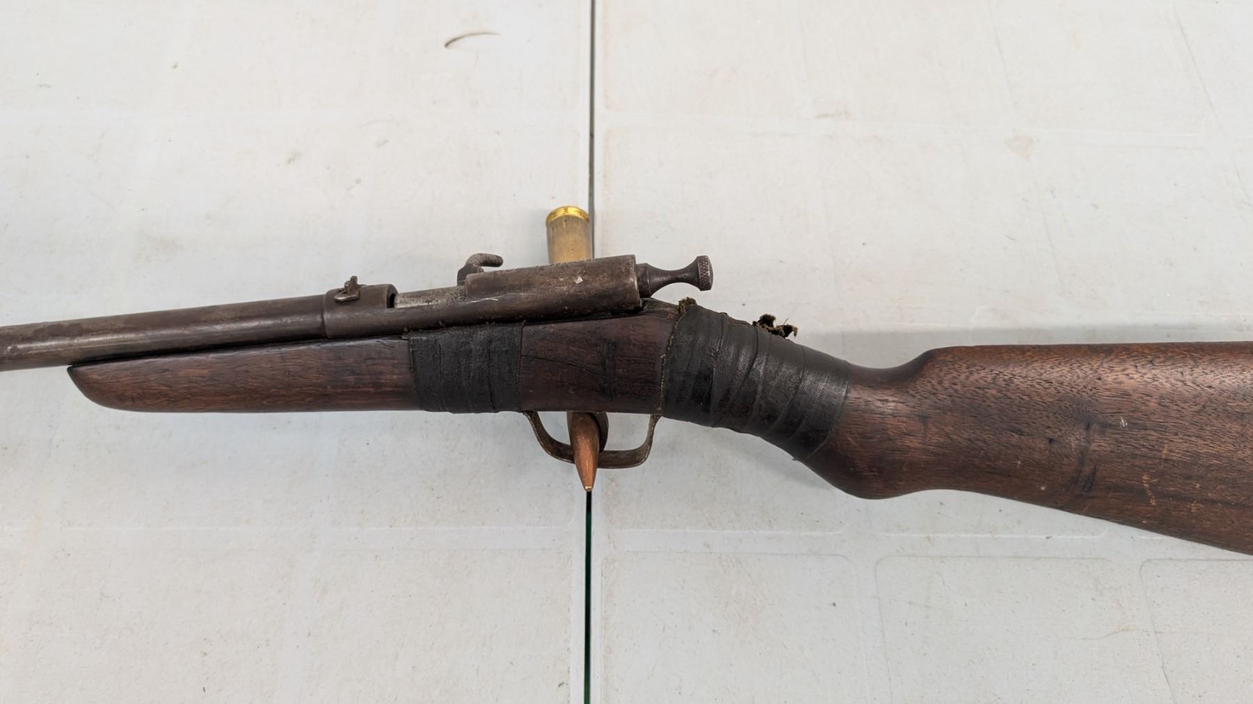 bolt action. No bluing left. Light freckling on exterior. Bore is shiny and bright. Action functions well. Stock has numerous cracks held together with tape. Bolt knob is missing