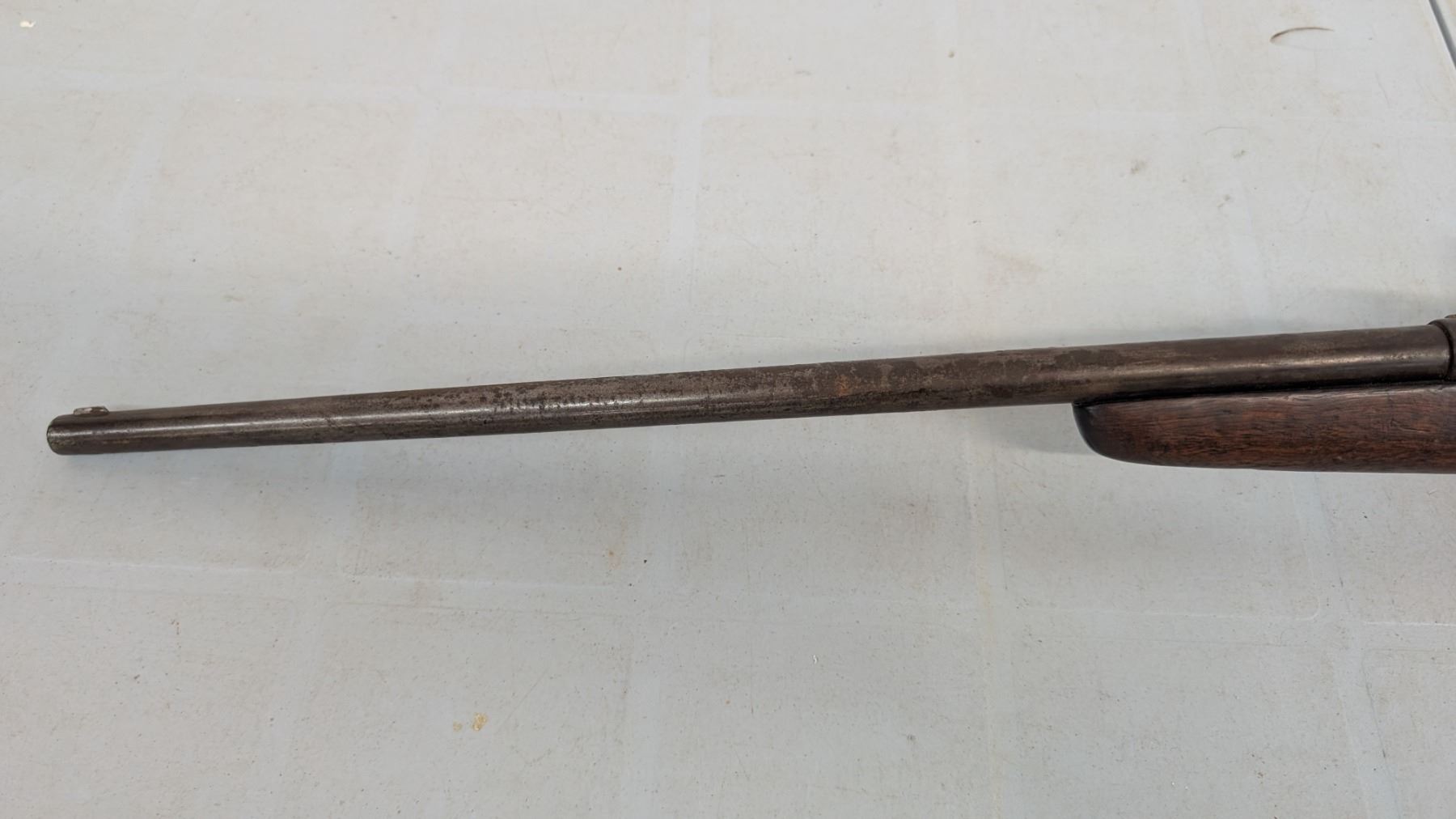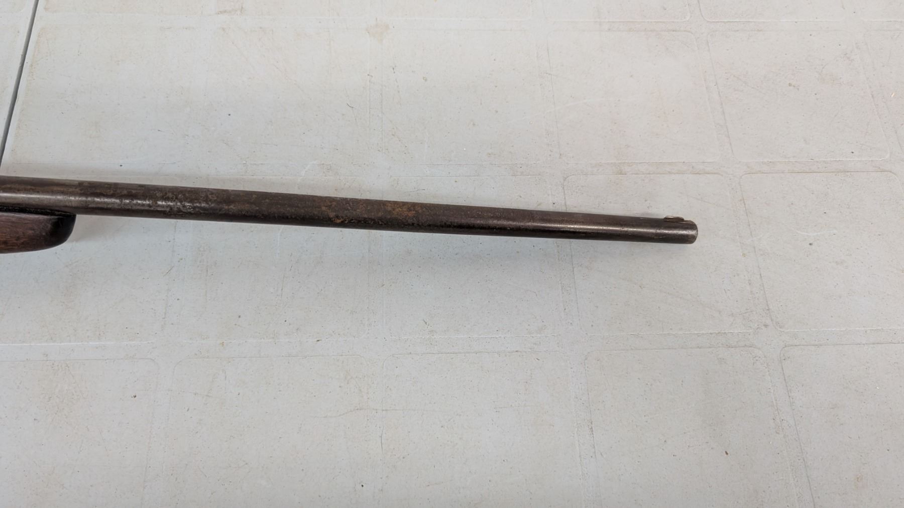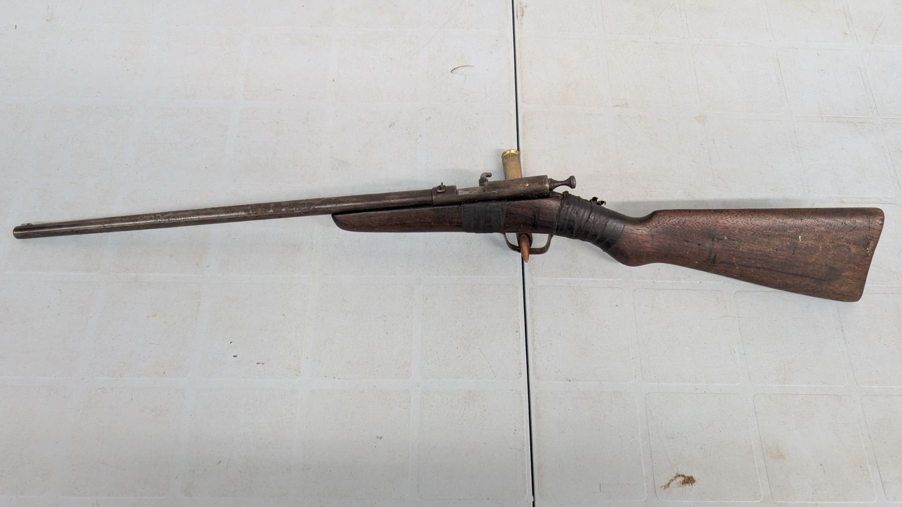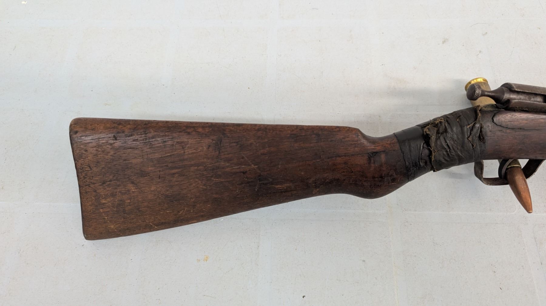 bolt action. No bluing left. Light freckling on exterior. Bore is shiny and bright. Action functions well. Stock has numerous cracks held together with tape. Bolt knob is missing