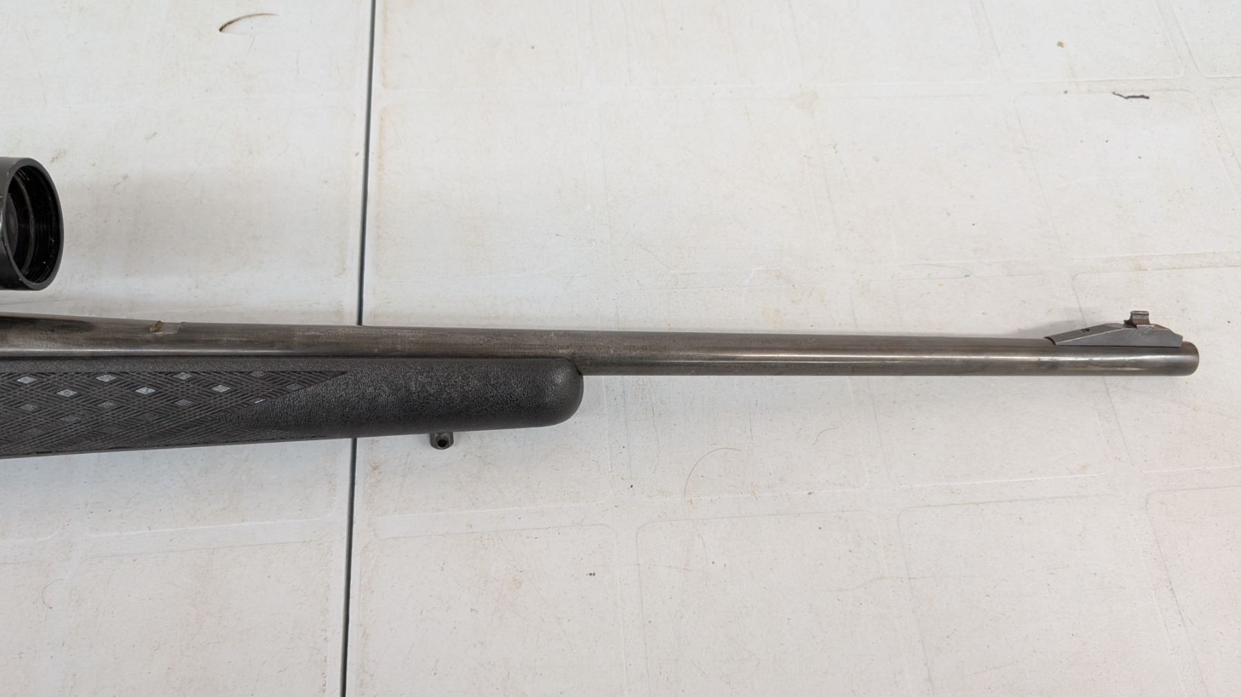 bolt action. retains approx 30% of its original finish. action functions smoothly. bore is shiny with crisp rifling. Ram line stock is in excellent condition. missing rear sight. comes topped with a Bushnell legends 3-9x40 scope. glass is clear.