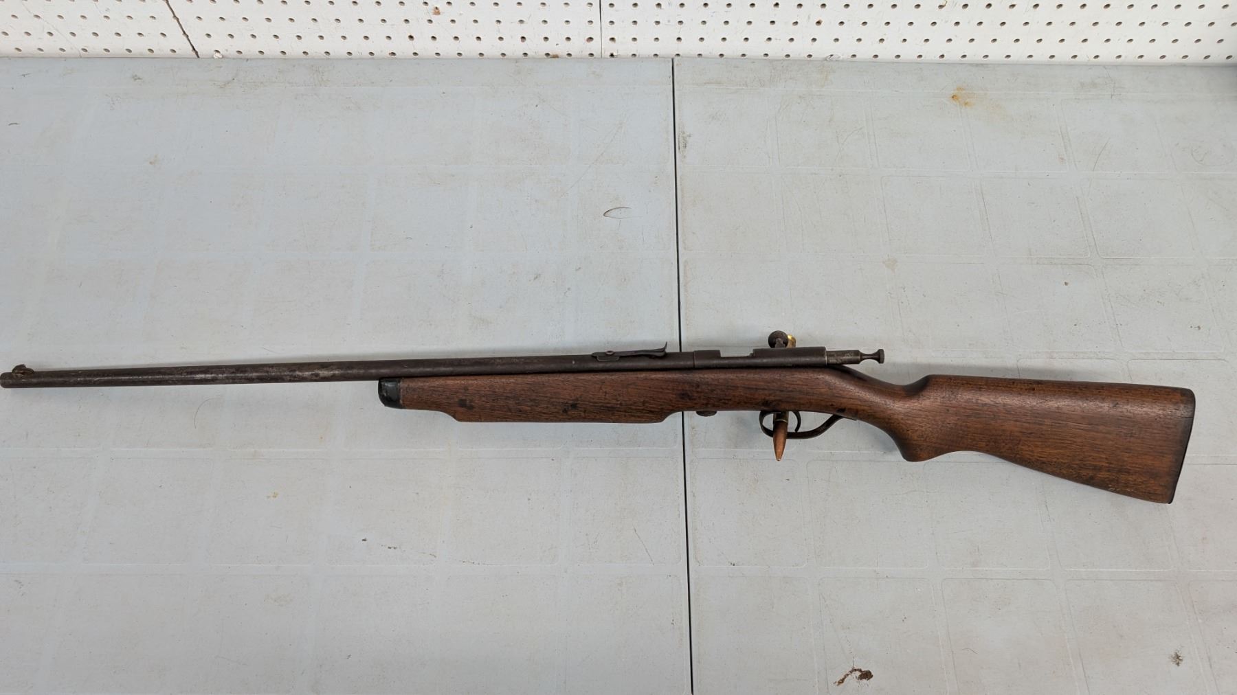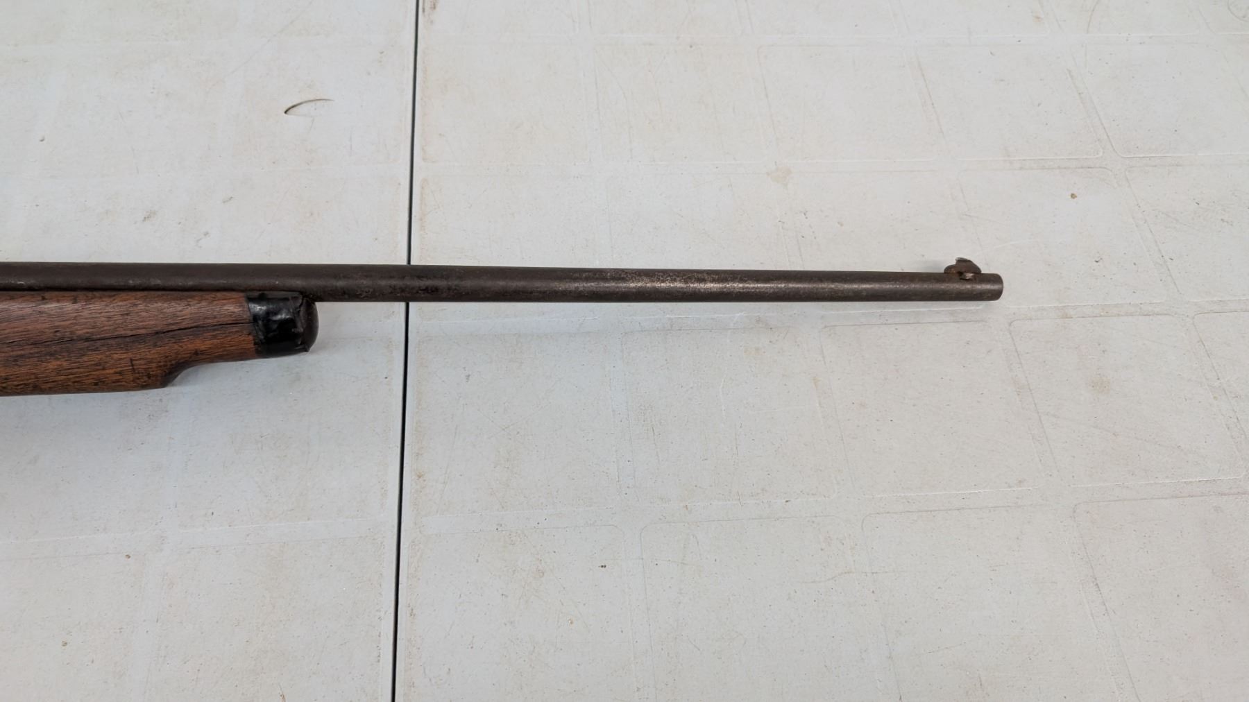 bolt action single shot. No original finish retained. action functions well. Bore is shiny with strong rifling. Stock is in poor to good condition with a crack in the forestock area.