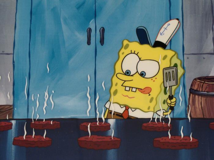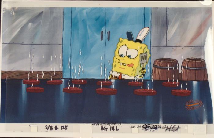 This animation cel and reproduction background are from the Nickelodeon TV show SpongeBob Squarepants. The story takes place under the deep blue sea in Bikini Bottom, where SpongeBob resides. SpongeBob, who is a yellow, porous sponge, is your typical happy-go-lucky character, as he is always cheerful and enjoys making people laugh. Patrick Star, SpongeBob's neighbor who is a starfish, is your average children's show idiot, as he boasts knowing nothing and is often getting himself into ridiculous situations. Between the homes of these two lies the home of the miserable Squidward, a squid, who is known for being grouchy and playing tricks on SpongeBob and Patrick. Both SpongeBob and Squidward work at the Krusty Krab, a fast food business run by the greedy money-loving Mr. Krabs, a crab, the arch rival of the evil, possibly misunderstood, Plankton. Another neighbor, Sandy Cheeks, an athletic squirrel who normally wears an astronaut's space suit, was introduced in "Tea at the Treedome." She spends most of her time inventing and experimenting. SpongeBob is cooking so patties on the grillOriginal Printed Background and Animated Cel Overall Size of Background: 10 1/2" x 17" Overall Size of the Cel: 10 1/2" x 16" Very good condition This is an original hand-painted cel set-up used in the production of an episode of "SpongeBob SquarePants." Each one-of-a-kind set-up represents a slight change in position of the characters. When individually photographed and projected in rapid succession, the images appear to move.
