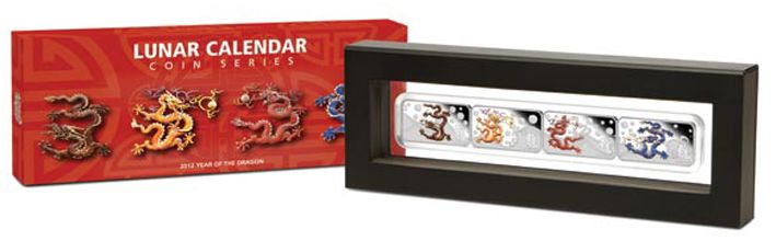 Four One Ounce .999 fine Silver Coloured Proofs. In display frame with box and certificate. FDC