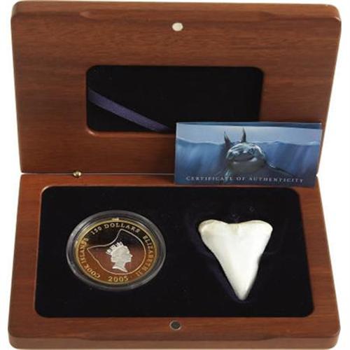 <B>Elizabeth II Bimetallic 150 Dollars 2005,</B></I> Silver 1/2 ounce within Gold 1 1/2 ounce featuring the Great White Shark and including a replica shark tooth. Struck by the Perth Mint of Australia and presented in the wood case of issue with the descriptive card and COA (#215.) Not currently listed in the SCWC.<BR><BR><b>Shipping:</b> Coins & Currency (<a target="_blank" href="http://www.heritageauctions.com/common/shipping.php">view shipping information</a>)