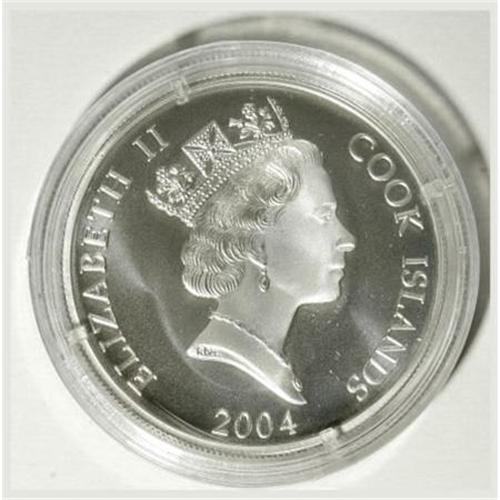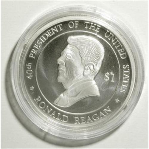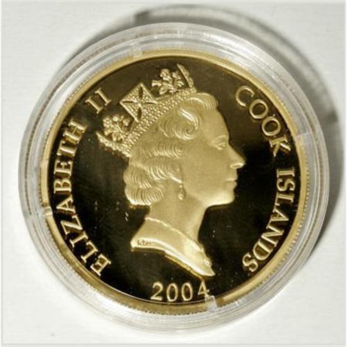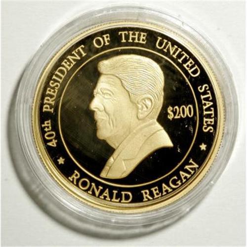 <B>Elizabeth II Proof Set 2004 - Ronald Reagan,</B></I> The silver Dollar and gold 200 Dollars in gem cameo Proof honoring Reagan as the 40th President of the USA. Not currently listed in the SCWC. Housed in the original blue snap-shut presentation case with the coins in plastic capsules. No COA included. The gold coin weighs 31.3 grams.<BR><BR><b>Shipping:</b> Coins & Currency (<a target="_blank" href="http://www.heritageauctions.com/common/shipping.php">view shipping information</a>)