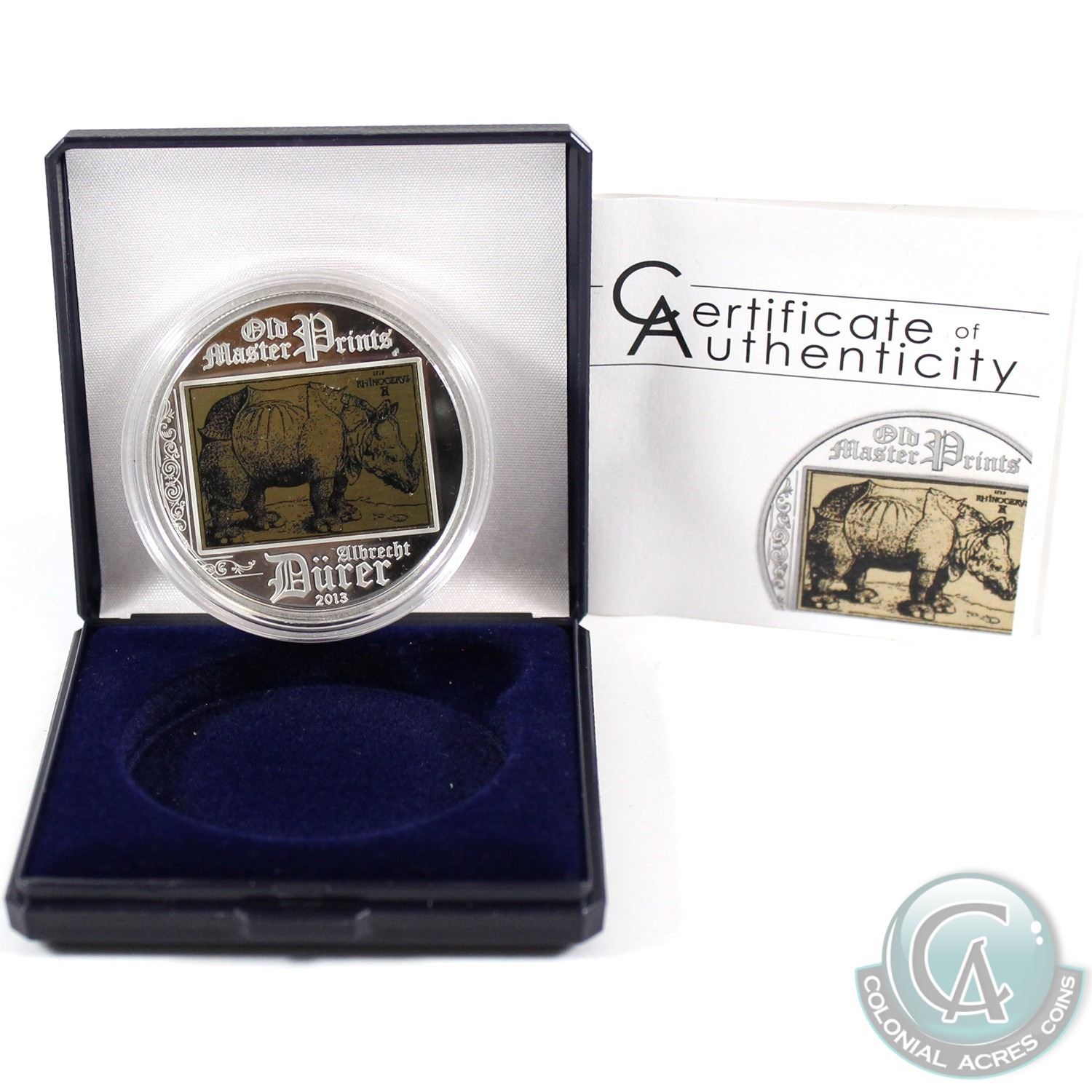 Cook Islands Mint Issue: 2013 Cook Islands $5 Albrecht Durer Rhinoceros Old Master Prints Sterling Silver Coin with Copper Inlay.