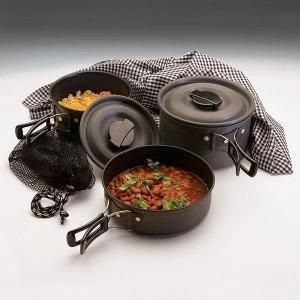 Features Contains: 7 in. fry pan with folding stay cool wire handles 1 qt. and 1 1/2 qt. cook pots with lids and stay cool handles Mesh carry/storage bag Vendor Part #: 13412 Weight: 1.80