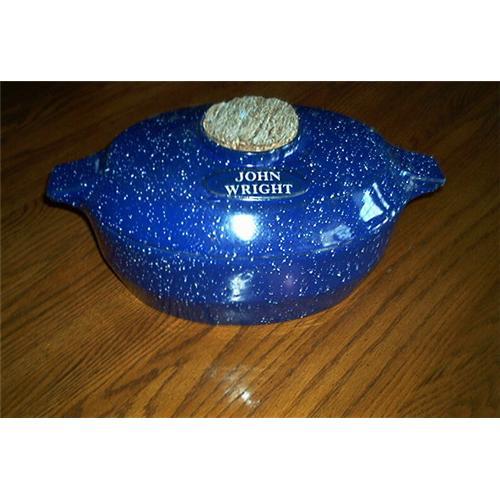 Featuring a cast iron, graniteware, cooker/steamer by John Wright. Weighs 10 pounds. Blue grantiteware covered cast iron. Cork stopper which measures 2 7/8 inches in diameter and thickness of 1 1/2 inches. The cooker/steamer measures (with handles)12 1/2 inches long by 7 1/4 inches wide, with a depth of 3 3/4 inches. Base diameter measures 9 inches long by 6 inches wide. Displays ridges on the bottom for even cooking. The lid displays the maker: JOHN WRIGHT. The lid measures, with handles 13 1/2 inches long by 8 inches wide. Fits snuggly to the bottom opening. Beautiful piece in excellent condition.