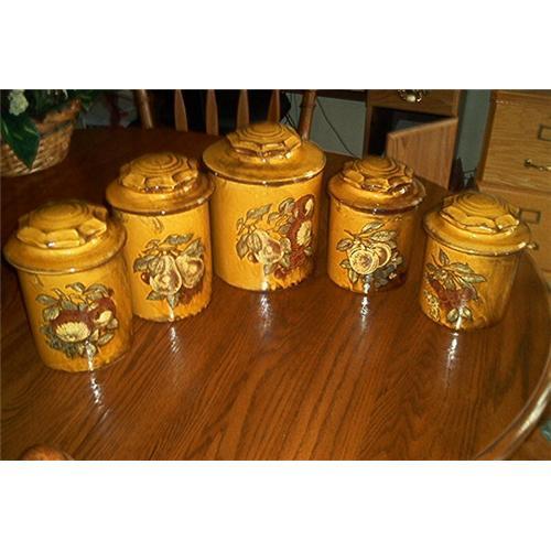 This is a beautiful set of a cookie jar and four canisters, all decorated with pears, nuts, cherries and leaves. Yellow-Gold-brown in color. These items are also decorated with large swirls. The front of each one has a pear or nuts, or cherries. (Fruit Designed in fall colors). The cookie jar displays a pear, nuts, and cherries with leaves. bottom back is embossed: HOLIDAY DESIGNS. USA. The bottom of one of the canisters has engraving, but, I cannot be sure of what it says. All are heavy and durable. All are highly glazed also. The cookie jar stands: 7 1/4 inches tall; The canisters stands in different sizes of: 6 3/4 inches tall;6 1/4 inches tall; 5 3/4 inches tall; and 5 1/4 inches tall; Bottom diameter of the cookie jar measures 6 3/4 inches; Bottom diameter of the canisters measures 5 inches. All are in excellent to mint condition with beautiful decorative lids. No chips, cracks, etc.