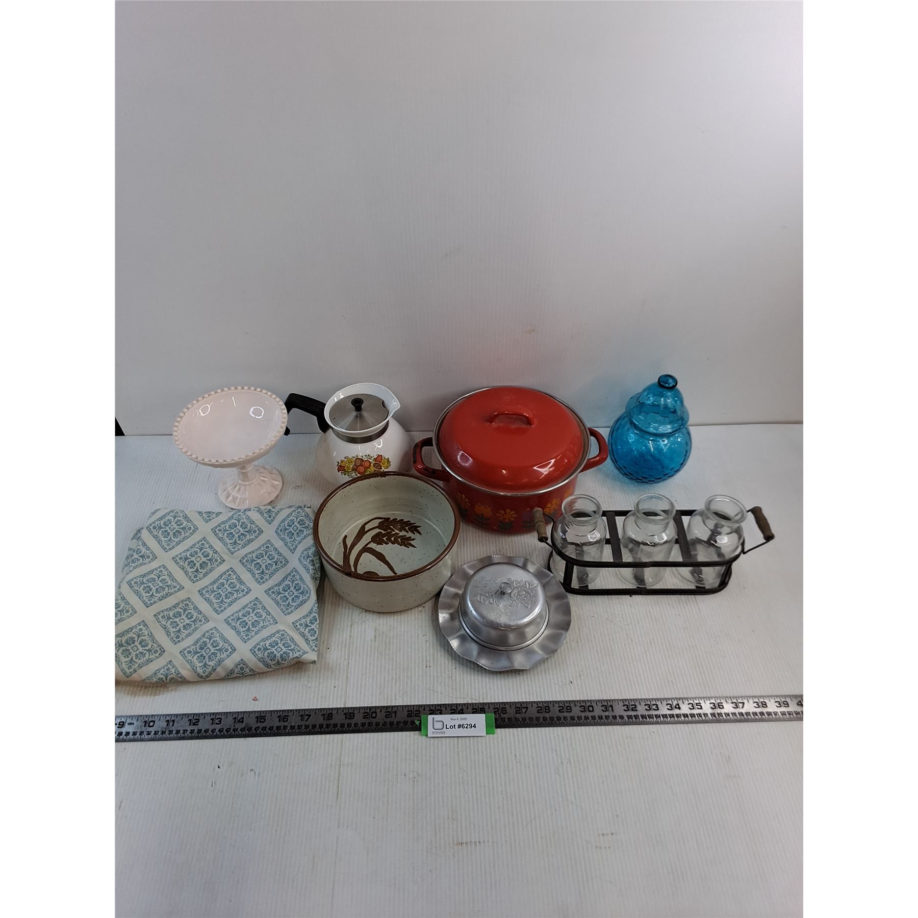 Cooking Pot w/Lid, Ceramic Bowl, Kettle, Candy Dish, Jar Set, Metal Butter Dish, Footed Trinket Dish