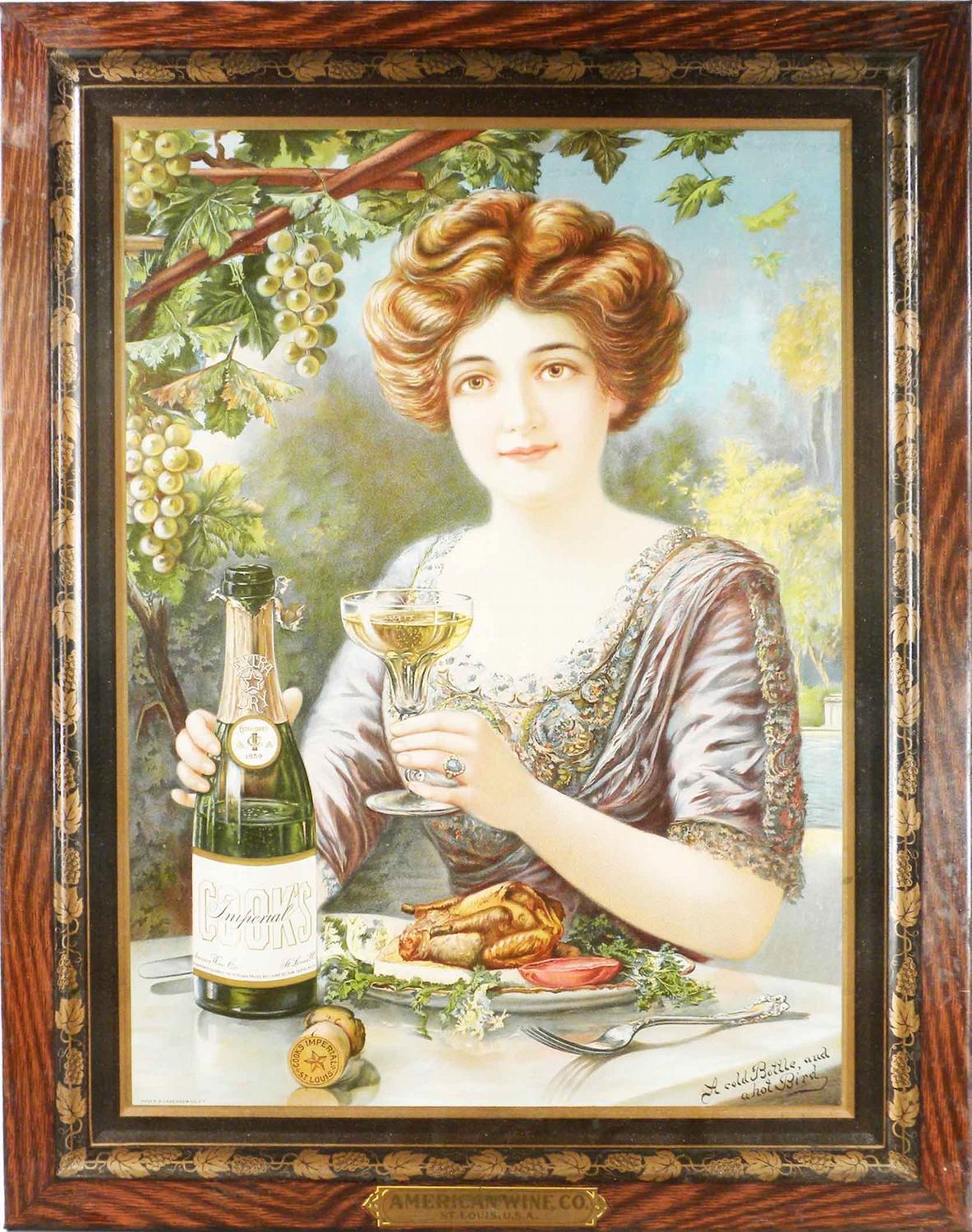 Cooks Imperial Champaign Self Framed Tin Sign. Entitled, "A Cold Bottle and a Hot Bird". American Wine Co. St. Louis. A few specs otherwise excellent condition. 22 1/4 X 28 1/2 inches.