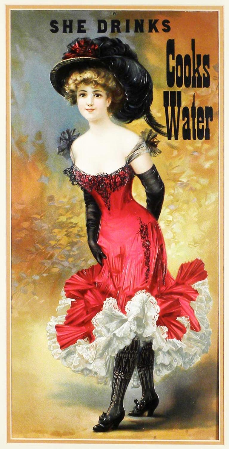 Cooks Water Embossed Paper Sign. Framed under glass in period oak. Near mint original condition. 11 1/2 X 23 inches.