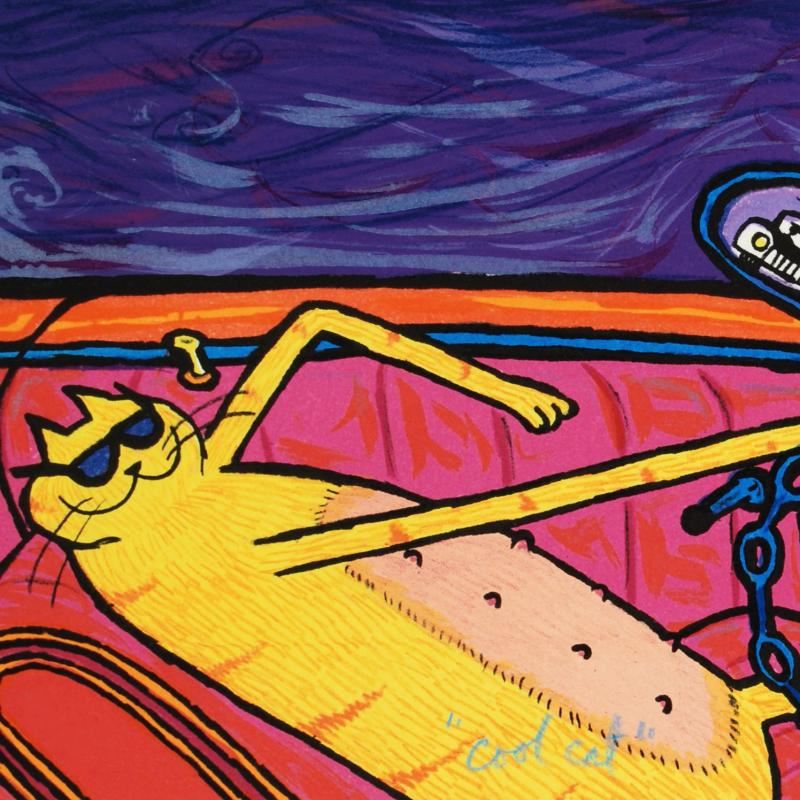 "Cool Cat By Matt" is a limited edition hand pulled original lithograph on museum quality, deckle-edge paper, numbered and hand signed by Matt Rinard. Includes Certificate of Authenticity! Measures approx. 18" x 8" (image). This lithograph was created on a rare antique Marinoni Voirin French press that dates back to the 1800's. It provides highly pigmented inks that will resist fading and preserve the integrity of the print for more than a lifetime. This process is the most elaborate, costly and effective way to reproduce art while maintaining the brilliance and accuracy of the original creation.