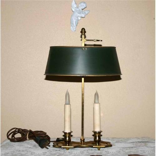 This is a fabulous working Brass Table Lamp created in the 1950s. The oval green metal shade can be adjusted up or down and measures 10 by 6 3/4. Complete with two lights, original cord, which we recommend replacing, the complete Lamp stands 15 ¾ of an inch tall with a 7 ¾ by 3 ½ inch base. In excellent physical and working condition; very Cottage Sheik!
