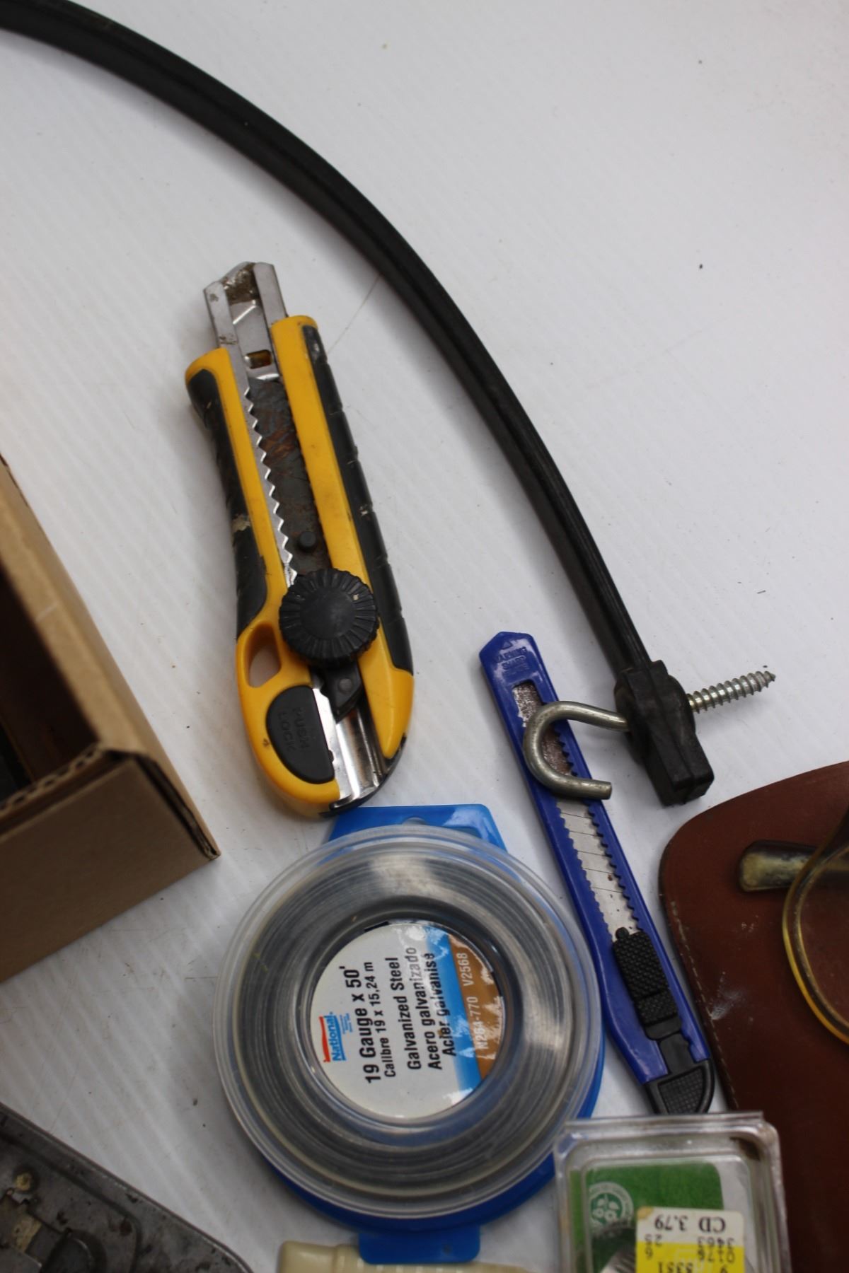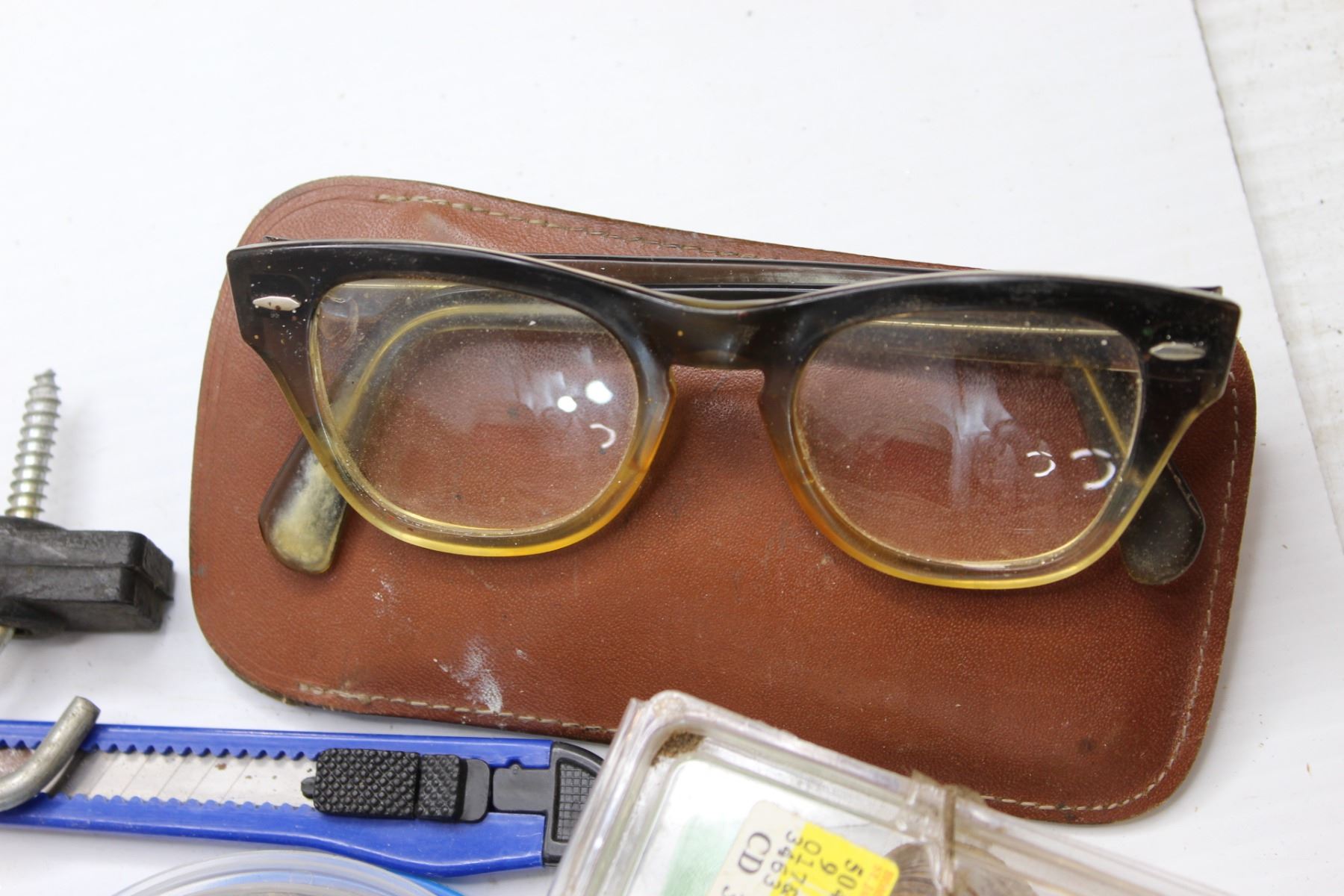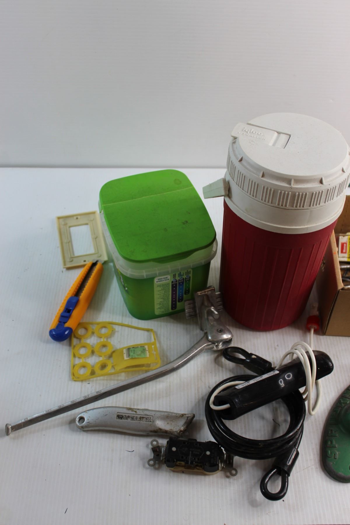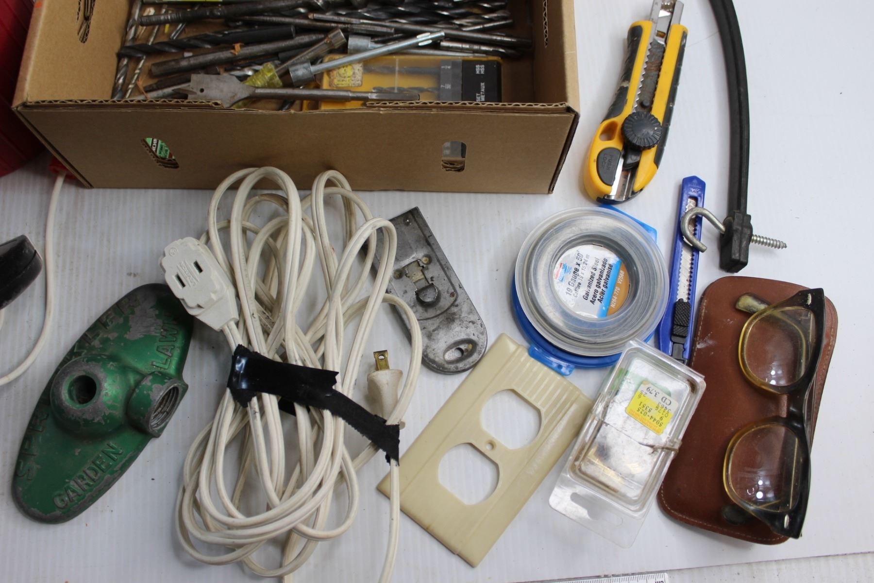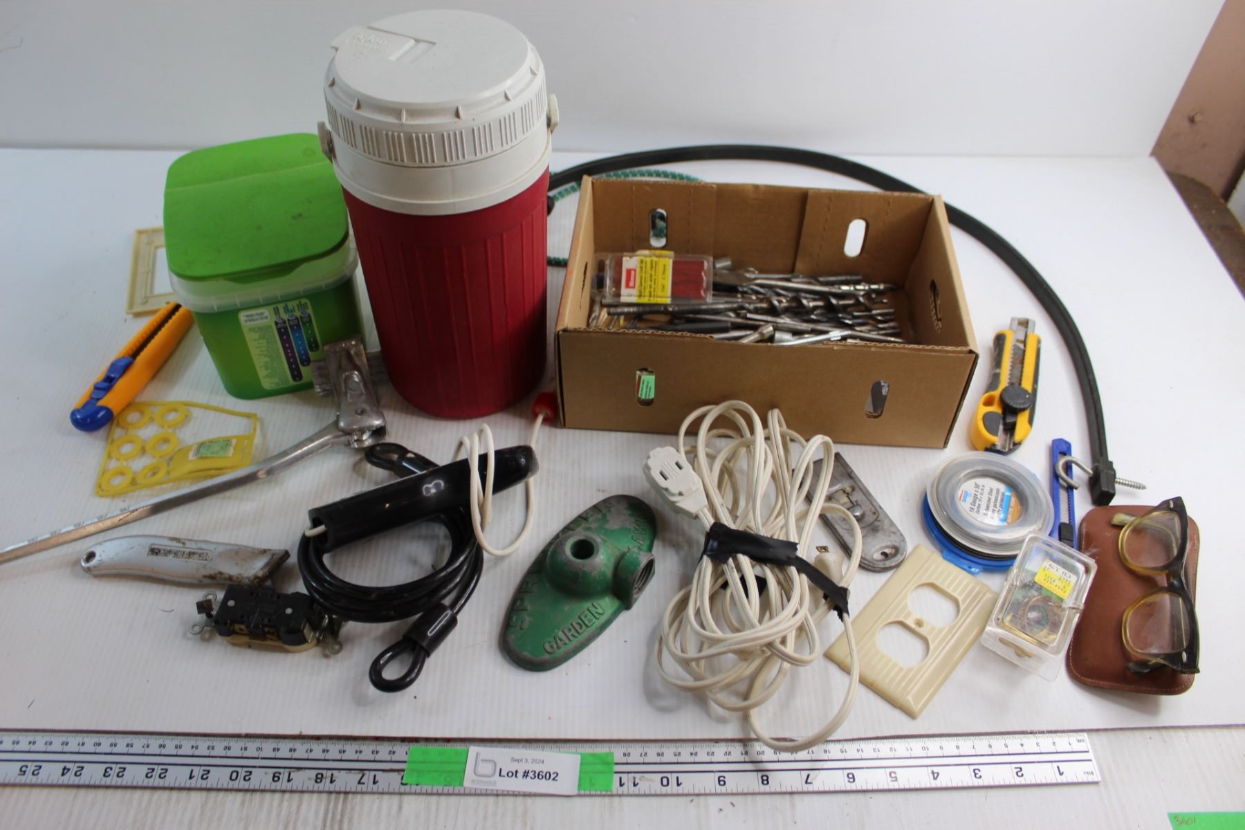 Cooler Jug, (4) Box Cutters, Vintage Glasses, Assorted Drill Bits and Assorted Items